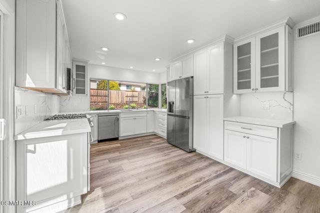 Welcome to this stunning two-story home in the highly desirable First Neighborhood of Westlake Village.This beautifully maintained residence features a fully remodeled kitchen with quartz countertops, soft-close pull-out cabinetry, and stainless steel appliances--perfect for those who love to cook and entertain. In addition, both upstairs baths have been completely remodeled with dual sinks in both as well as beautiful finishings. The home offers luxury vinyl flooring throughout, custom designer paint, and a flexible floor plan. All bedrooms are located upstairs, providing privacy and comfort. Downstairs, you'll find a spacious recreation room complete with a cozy gas fireplace and a built-in wet bar--ideal for relaxing evenings or gathering with guests.Step outside to your own private backyard retreat, highlighted by a tranquil pond and cascading waterfall--a peaceful setting to unwind after a long day.As part of the First Neighborhood community, you'll also enjoy access to fantastic amenities including a sparkling community pool, lush greenbelts, and beautifully maintained common areas.Additional features include a three-car garage with a utility sink, gardener service included for added convenience.Available now--don't miss this opportunity to lease a beautiful home in one of Westlake Village's most sought-after neighborhoods!Some photos have been virtually staged.