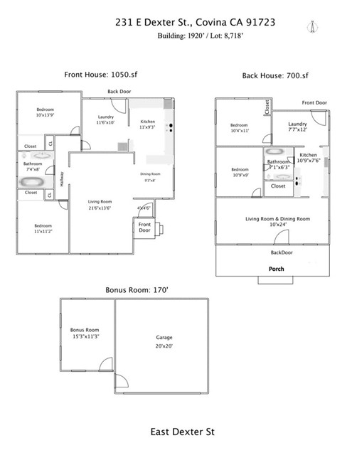 231 & 231-1/2 E Dexter: Two separate single-family house on one 8,721 sq ft R3 lot—ideal for multi-generational living, rental income, or future development. Front House: Approx. 1,054 sq ft, 2 bed/1 bath home featuring tile flooring in main areas, wood floors in bedrooms and hallway, a spacious gourmet kitchen with indoor laundry, and central A/C for year-round comfort. Garage & Bonusroom: Detached two-car garage with an approx. 170 sq ft bonus room—ideal for storage, an office, or hobby space. Back House: Approx. 700 sq ft with private alley entrance, 2 bed/1 bath, laminate flooring in living areas and bedrooms, and tile in the kitchen, indoor laundry. Yard: Beautifully maintained front, middle, and backyards create a tranquil setting, with separately metered utilities, individual trash account, and concrete driveways offering ample parking. Note: The pictures in the living room, dining room, bedrooms and bonus room are virtual staging. All photos were taken before the tenant moved in.