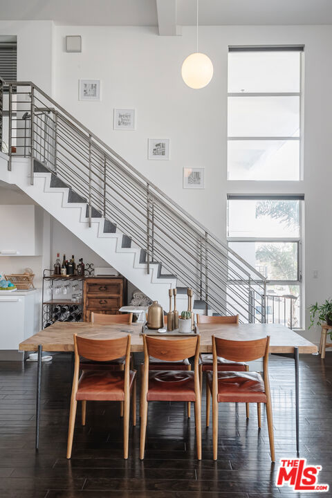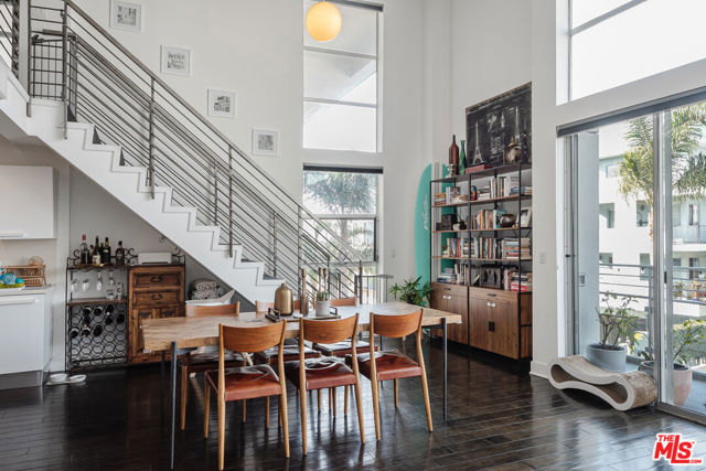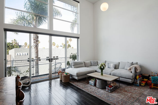 This modern loft in the heart of the Marina Arts District blends style and functionality with stunning design elements throughout. As you enter, you're greeted by a bright foyer and an abundance of natural light pouring through expansive, north-facing floor-to-ceiling windows. The open layout spans two levels with soaring ceilings, sleek finishes, and distinct areas for living, working, and entertaining. Dark hardwood floors provide a striking contrast to the clean white walls and polished chrome accents. The chef's kitchen is perfect for entertaining, featuring contemporary countertops, cabinetry, and high-end appliances. Upstairs, you'll find a spacious primary suite with its own bathroom for added convenience. The living room opens up to a balcony that overlooks the vibrant street below, offering a private outdoor retreat. The home includes two potential bedroom spaces, or a combination of a primary bedroom and a den/office, plus two full bathrooms. Located in a highly sought-after area, you're just moments away from the best of Marina del Rey - restaurants, shops, beaches, and easy access to Abbot Kinney, freeways, and more!