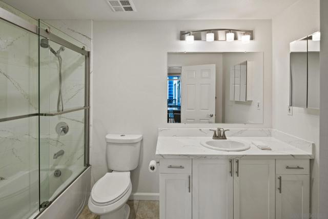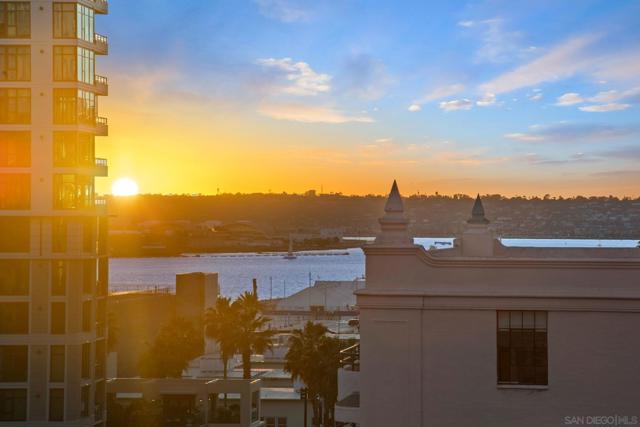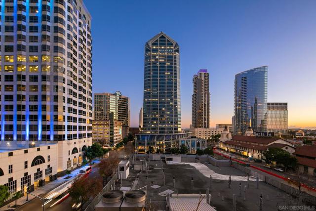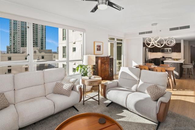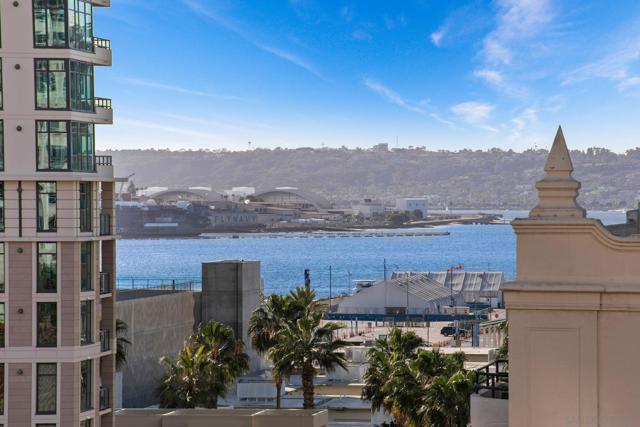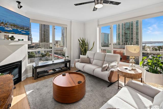 Prime southwest corner residence at Treo in the prestigious vibrant Columbia District/Little Italy, showcasing sweeping panoramic views of the downtown skyline and sparkling bay and waterfront. Offering approximately 1,441 square feet, this beautifully remodeled 2-bedroom, 2-bath plus 3rd room den/office floor plan is elevated by its desirable corner positioning and two private balconies that capture water and city views plus natural light throughout. Designed as a true turnkey opportunity, every detail has already been thoughtfully curated. Luxury vinyl plank flooring flows seamlessly throughout the home, complemented by a stunning remodeled kitchen with sleek quartz countertops, tile backsplash, designer cabinetry and stainless steel appliances. The upgraded bathrooms feature modern finishes and clean, contemporary design. Fresh interior paint enhances the light and airy aesthetic. Two secured parking spaces and dedicated storage add exceptional convenience. Ideally positioned in one of Downtown San Diego’s most walkable neighborhoods, residents enjoy effortless access to the Waterfront Park, Little Italy’s renowned dining scene, the Embarcadero, Seaport Village, Santa Fe Depot, and premier shopping and entertainment. Treo offers resort-style amenities including a lap pool and spa, state-of-the-art fitness center, resident lounge, outdoor BBQ area, on-site management, and secured entry. With its prime location, impeccable condition, and exceptional lifestyle appeal, this residence truly embodies the best of urban luxury living.