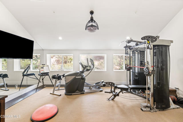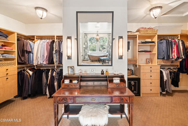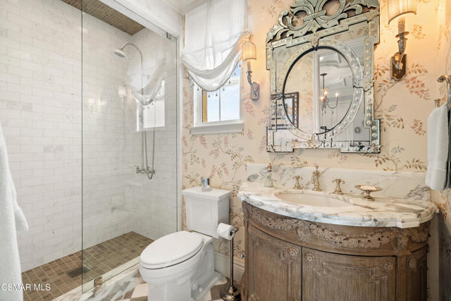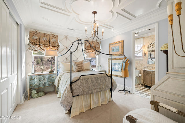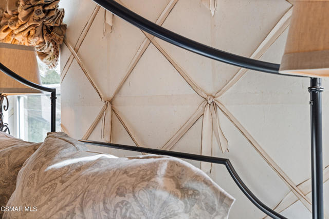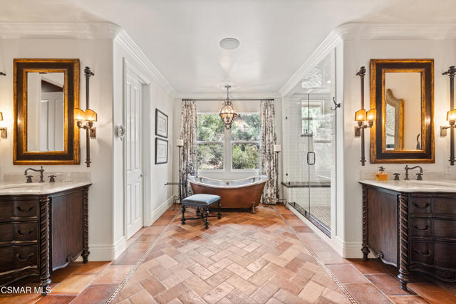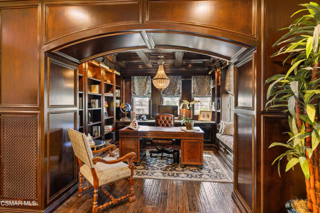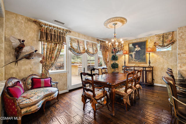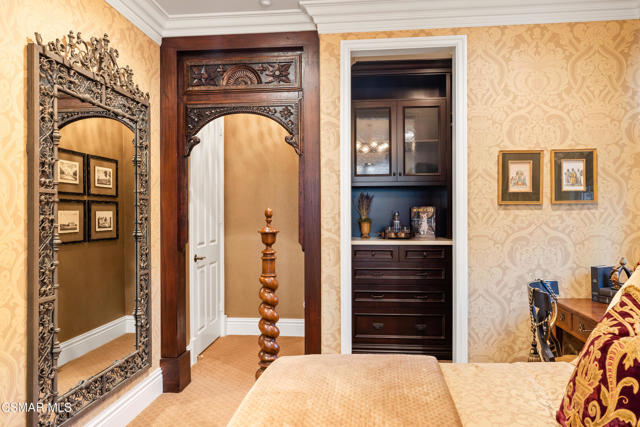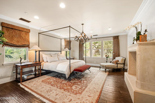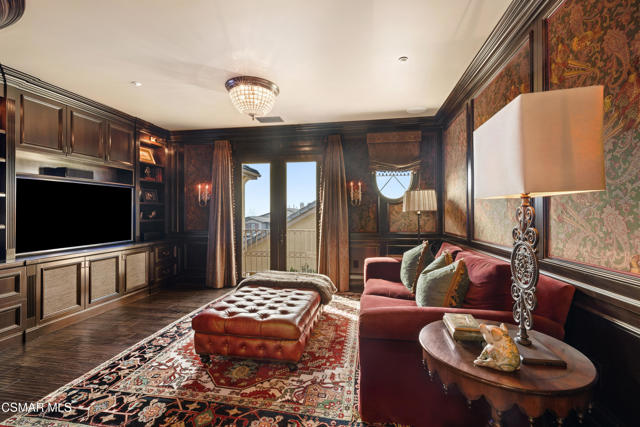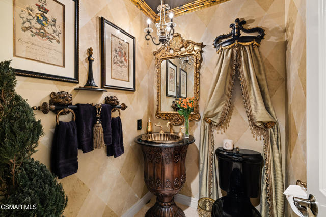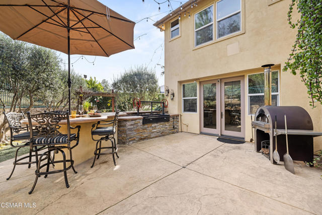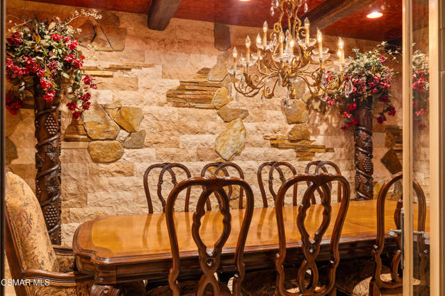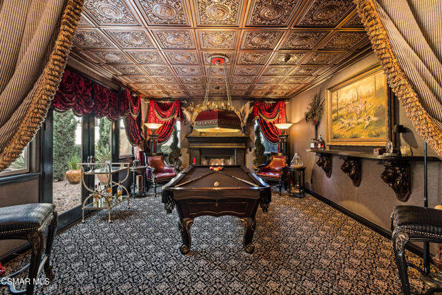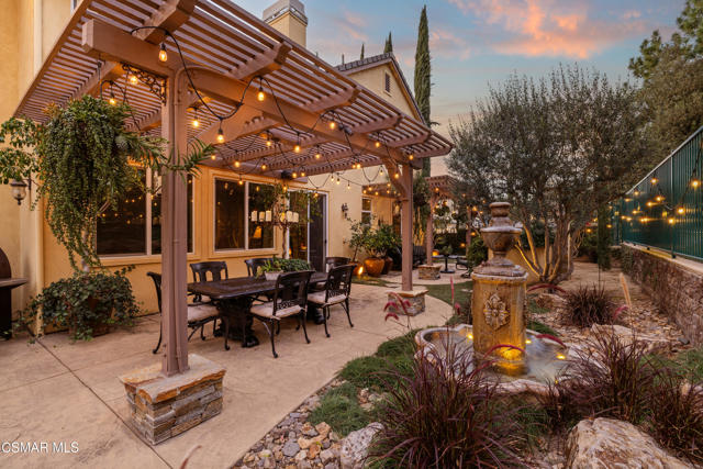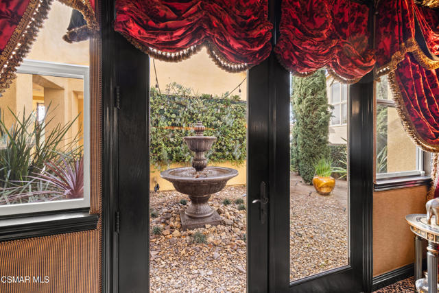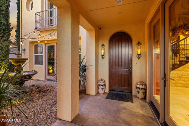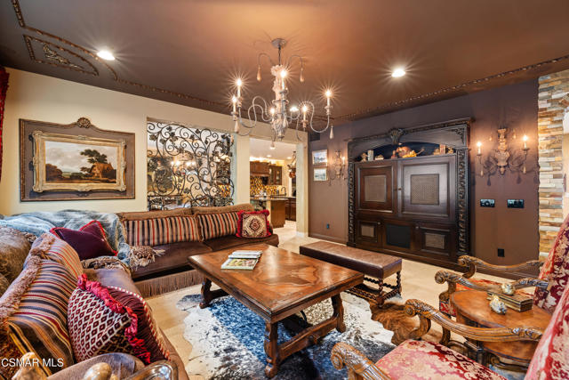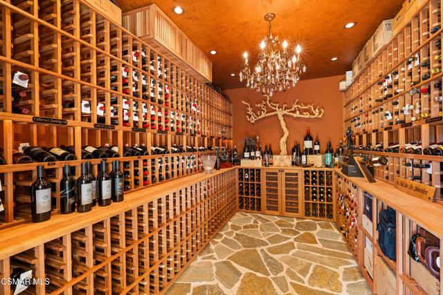Nestled within the prestigious Big Sky community of Simi Valley, this extraordinary residence has been masterfully curated by professional designers to deliver a seamless blend of sophistication, comfort, and Southern California indoor-outdoor living.A private gated courtyard welcomes you with a stunning illuminated fountain -- setting the tone for the elegance that unfolds within. Before stepping fully inside, discover a true showpiece: a 2,500-bottle walk-in wine cellar with custom lighting and precise temperature and humidity control -- designed for the discerning collector.Inside, travertine marble floors with hand-inlaid mosaic details lead you through thoughtfully designed living spaces. The pub-style game room features a cozy fireplace, pool table, and French doors that open to the courtyard, creating an inviting space for entertaining. The formal dining room is equally impressive, showcasing a Venetian plaster ceiling, stacked stone accent wall, and French doors for effortless alfresco dinners.The gourmet kitchen is a chef's dream, appointed with granite countertops, a center island with prep sink, and top-tier appliances including a Wolf 6-burner professional cooktop, Thermador double ovens, and a built-in Sub-Zero refrigerator. Rich dark wood cabinetry and a meticulously hand-cut tile backsplash complete the space. The kitchen flows seamlessly into a spacious breakfast area and a warm, inviting family room with fireplace, built-ins, surround sound, and French doors to the patio.A private downstairs guest suite offers elegant hand-painted walls, crown molding, and a beautifully appointed ensuite bath with custom herringbone travertine tile and walk-in shower.Ascending the dramatic travertine and wrought iron staircase, you'll find a spacious loft-style office with rich wood paneling, custom coffered ceiling, and built-in bookcases. The expansive primary suite is a private retreat featuring hardwood floors, a marble fireplace, wood-paneled walls, and a dedicated sitting/theater room with padded walls, built-in media center, and surround sound. A fully enclosed 250 sq ft gym adds functionality and flexibility.The spa-inspired primary bath showcases custom inlaid flooring, a designer walk-in shower, dual vanities, and a stunning freestanding copper clawfoot tub. Dual custom walk-in closet areas complete the retreat. Two additional upstairs bedrooms feature bespoke wall treatments and ensuite baths with custom finishes.Whole-home audio is powered by a built-in Sonos sound system with individual room controls throughout key living spaces.Step outside to a backyard reminiscent of a Tuscan villa -- complete with computer-controlled string lighting, a wood-burning fireplace, dual covered patios, and an entertainer's dream outdoor kitchen featuring a built-in Santa Maria BBQ, wood-fired pizza oven, and Traeger smoker. Lush yet drought-conscious landscaping includes fruitless olive trees, raised garden beds, fountains, and a drip irrigation system -- all designed for beauty and ease.Located in the highly sought-after Big Sky community, residents enjoy access to scenic walking and hiking trails, a dog park, softball fields, and breathtaking mountain views -- all just minutes from everyday conveniences.This is more than a home -- it is a lifestyle destination.