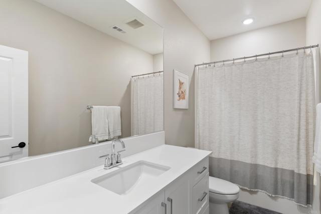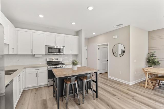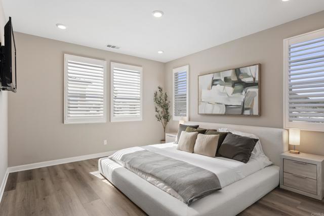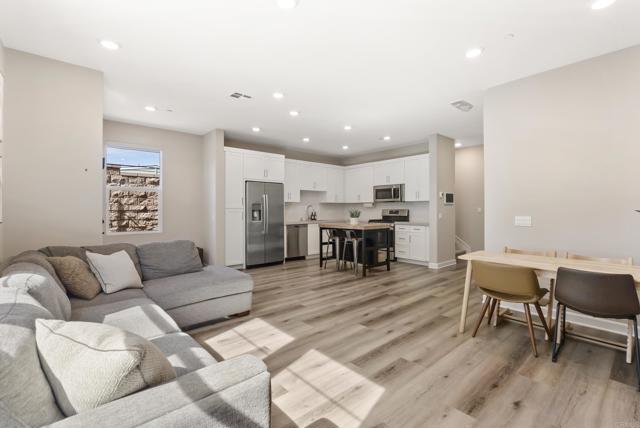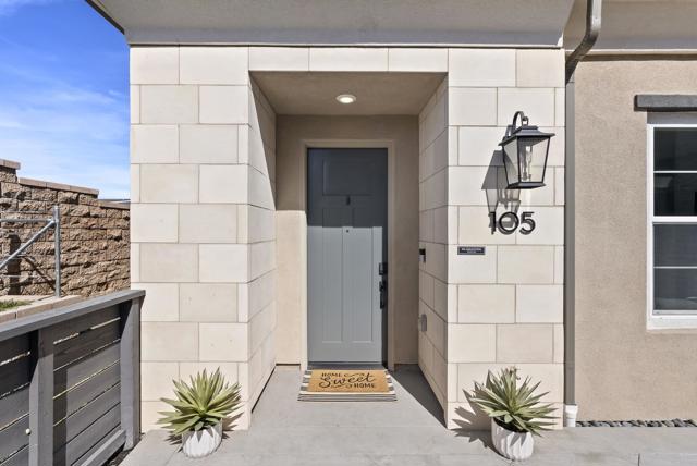 Welcome to this gorgeous 3-year-new end unit townhome in the sought after hill top community of Sunrise. Tucked along the western edge of the community, this home is light and bright with windows on 3 sides. A custom stamped concrete patio welcomes you to front the door and is the perfect spot to BBQ, play or relax outside. Inside, the 1st floor features an open-concept layout and a beautiful kitchen with white shaker cabinetry, sleek quartz countertops, upgraded tile backsplash and stainless steel appliances. Luxury vinyl plank flooring and custom accent wall add warmth to the main living area. A powder room and direct access two car garage with tankless water heater and EV Charging round out the first floor. Upstairs, upgraded carpeting and large stairwell windows lead to a versatile central loft, perfect for a home office, den, or playroom. The primary suite is a true retreat, offering abundant natural light, plantation shutters, a walk-in closet, and an en-suite bath with dual sinks. Two spacious secondary bedrooms, a generous hall bath, and a full size laundry room with upper and lower cabinetry complete the second level. The home includes a front door smart lock, ring doorbell and OWNED SOLAR PANELS for energy efficiency. Residents of Sunrise enjoy resort-style amenities, including a large heated pool and spa, BBQ area, showers and restrooms, and multiple tot lots for outdoor fun. This serene enclave of townhomes is located in a private gated neighborhood with a wonderful location. Less than three miles from CSUSM and close to Palomar Medical Center and Kaiser Hospital, this home is perfect for professionals, students, university staff, and healthcare workers seeking high-quality living in a peaceful setting. The best shopping and dining experiences are near by and there is easy access to major freeways. Come see it today!