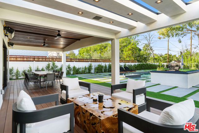 Located on a quiet tree-lined street in Walnut Acres, sits this masterfully restored, approx. 4,000 sqft single-story modern home. This 5 bed 4 bath gated estate is a thoughtful and careful, high-end restoration which is available fully furnished! Travel down the illuminated hallway leading into a stunning open concept living space, showcasing an expansive chef's kitchen with double-island and high-end finishes, dining area with bar, formal living room with color-changing fireplace, and a separate meditation den, all opening up to the expansive yard, perfect for entertaining. Each bedroom features high ceilings, and large closets with built-in storage. The grand primary bedroom features a walk-in closet, as well as a sleek en-suite bathroom complete with a dual sink vanity and separate shower and deep soaking tub. From the sliding glass doors of the living room, step outside to a most ideal entertainment setting. The covered patio space provides a relaxing lounge space with heaters, and opens out to a zero-edge pool with jacuzzi, fire-pit and basketball court. This entertainer's dream is also equipped with a smart home system, security alarm, and exterior cameras. Property is available for lease, filming, and photography. Centrally located near the Topanga Mall, The Village, Fallbrook Center, Trader Joe's, HomeGoods, and much more!