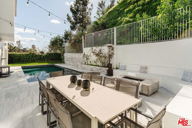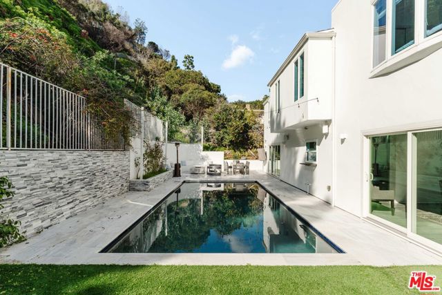 Set in the famed Marquez Knolls, this contemporary residence offers serene privacy in a truly bucolic setting. Guests are welcomed by a stately foyer with gallery walls, leading into an expansive open floorplan designed for seamless entertaining. The great room, anchored by a sophisticated fireplace and formal dining area, is bathed in natural light from large southern-facing windows. The chef's kitchen is a masterclass in design, featuring a Wolf 6-burner double oven, Sub-Zero fridge/freezer, and custom cabinetry centered around a striking waterfall countertop with informal dining. An inviting family room adjoins the kitchen, creating a perfect hub for daily life. Upstairs, the primary suite serves as a private sanctuary, detailed with custom built-ins, skylights, and a large custom closet. The spa-like ensuite bath features dual vanities and an oversized shower with a bench. Three additional bedrooms off the landing offer breathtaking canyon and ocean vistas, sharing a bright, designer bathroom with tub and shower. The resort-caliber backyard is an entertainer's dream, featuring a saltwater pool with a baja shelf, a spa, and a built-in firepit lounge. A dedicated BBQ station services the alfresco dining terrace, while a lush, fenced lawn wraps around the home. The home is completed by a 2-car garage that also functions as a gym along with a laundry area. Located in a tight-knit community known for its resilience and charm, this home offers the quintessential Palisades lifestyle.