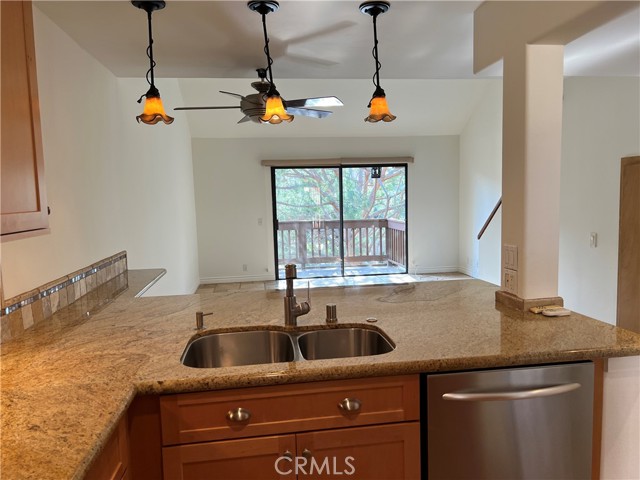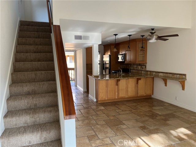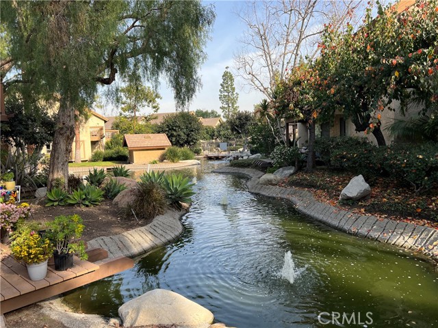 Upper Carriage unit with Balcony over looking Cascading stream will put you to sleep , just the sound of relaxation . Newer painted interior neutral color feeling light and open .. Downstairs offers remodeled Kitchen with fridge and granite counters. Main floor bedroom with remodeled bath, Dining area combines with open family room , leading to Balcony to enjoy a glass of wine overing looking stream ..Flooring on main floor offers custom tumbled stone . stairway leads to large private loft perfect for in home office or could be used as a second BR with newer carpeting .. unit offer carport parking # 406 . Unit has use to community tennis courts and pool nearby . unit is located in building 33 . This unit is move in ready condition for quick occupancy .