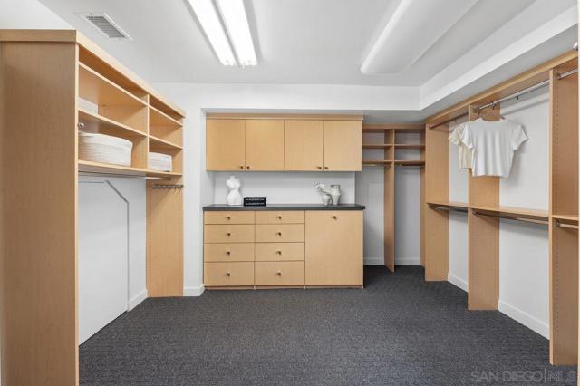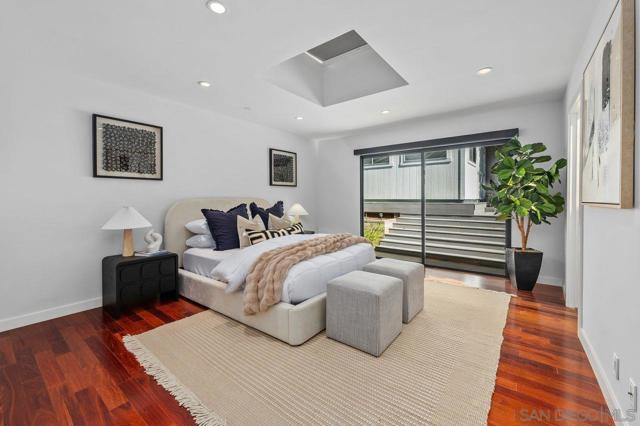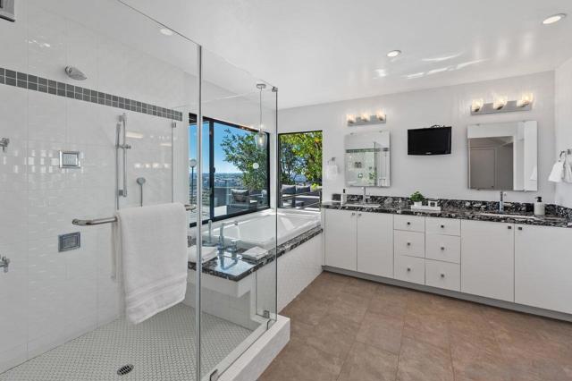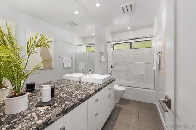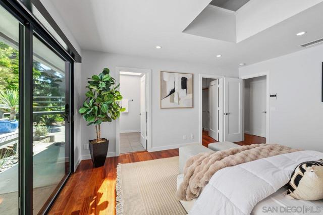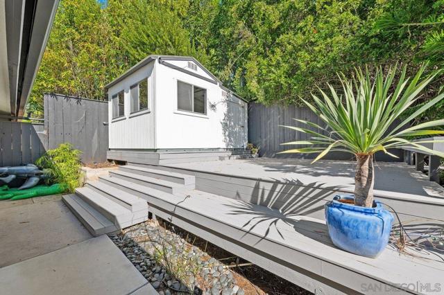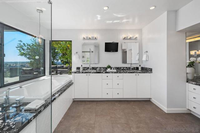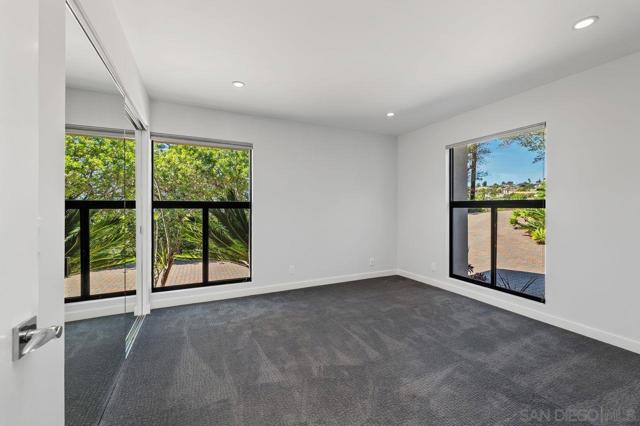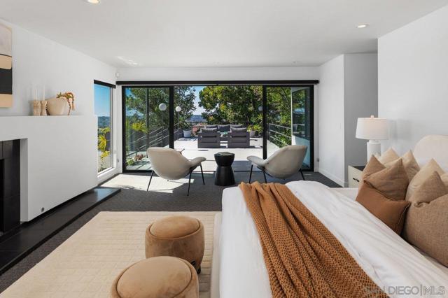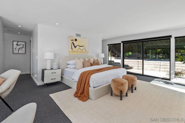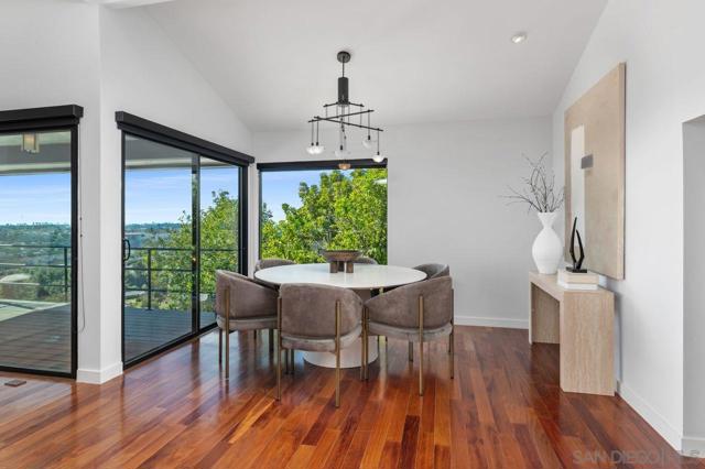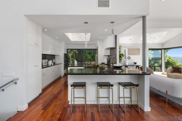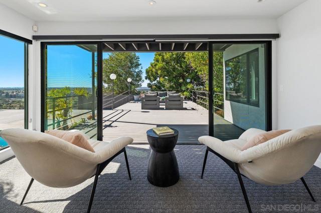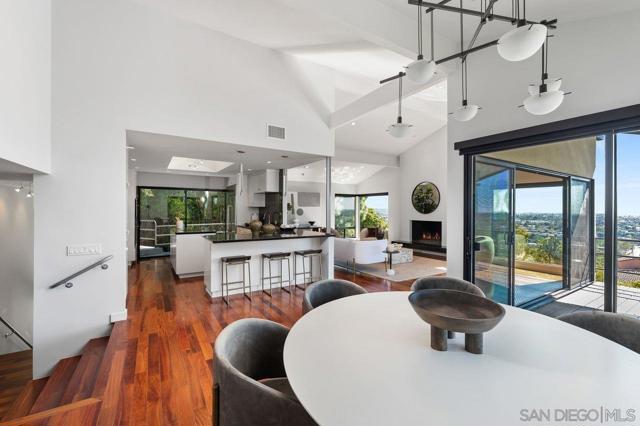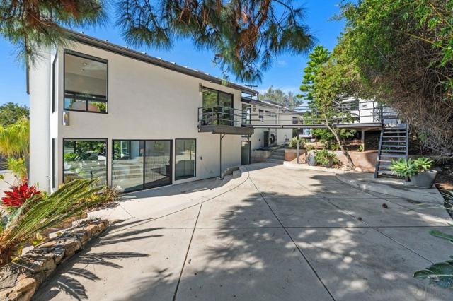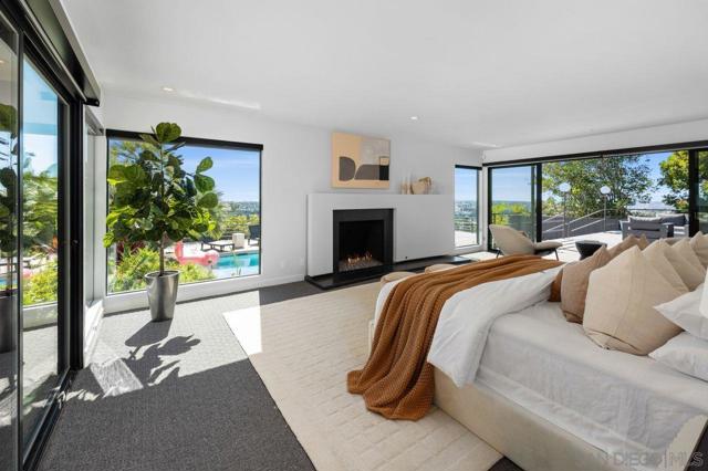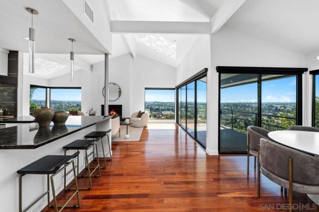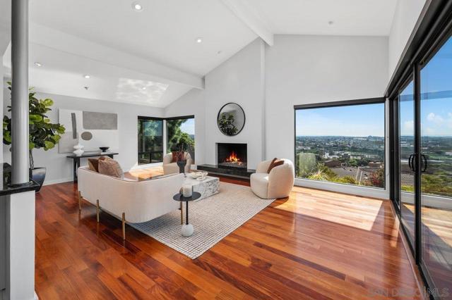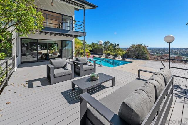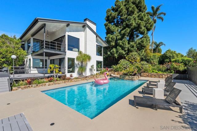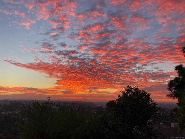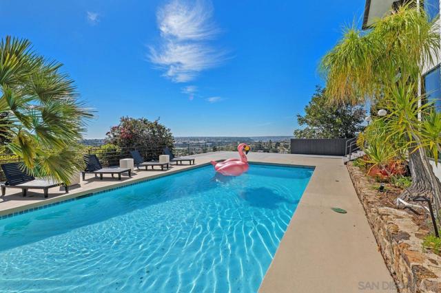 Views, Views & more Views! Enjoy sweeping panoramas from downtown San Diego to the Coronado Islands with sparkling evening lights of the Coronado Bay Bridge & seasonal fireworks. This mid Century Modern home sits in a premium Del Cerro neighborhood. Warm Brazilian hardwood floors welcome you upon entry & continue throughout the upper level & staircase complemented by vaulted ceilings & an abundance of natural light. The flexible floor plan offers dual primary suite options. The larger of the 2 is downstairs with a fireplace, entertainment deck overlooking the pool & views, large walk in closet/dressing area with custom built-ins & a generous spa-style bath, shower and dual vanities plus a make up area. Alternatively it could serve as the family room utilizing the upstairs primary with ensuite bathroom. Lovingly maintained & recently upgraded including cabinet improvements, appliances, newer sewer main, electrical/panel with increased amperage, EV Car Charger, owned solar, approximately 3 yr old HVAC & approx $60K in exterior upgrades for pool coping, landscaping/concrete & pool gas line installed in 2021. Designed for exceptional entertaining, the outdoor spaces embrace the breathtaking views & seamless indoor-outdoor living. A 13X11 private Tuff Shed with electrical offers the perfect opportunity to create a private office, gym, music or art studio. Ideal location with easy access to SDSU, Fashion/Mission Valley, nearby hiking/recreation areas, great schools & more. Flame was virtually added to the fireplaces. Tax records may reflect a park fee.