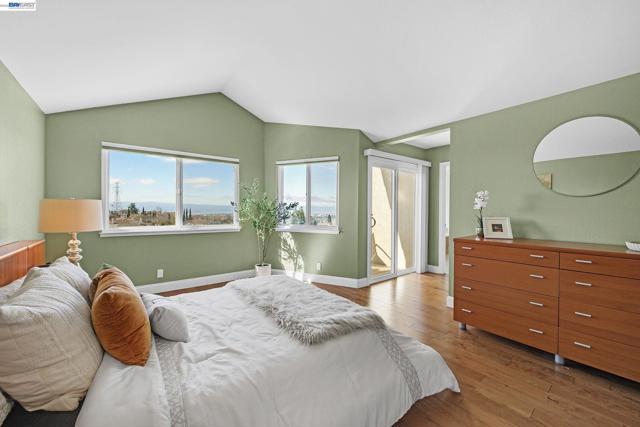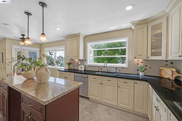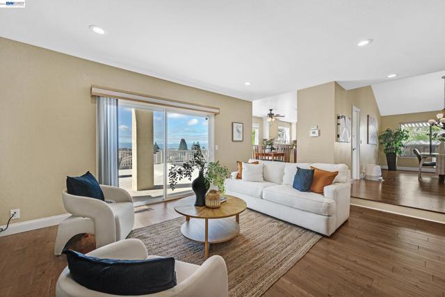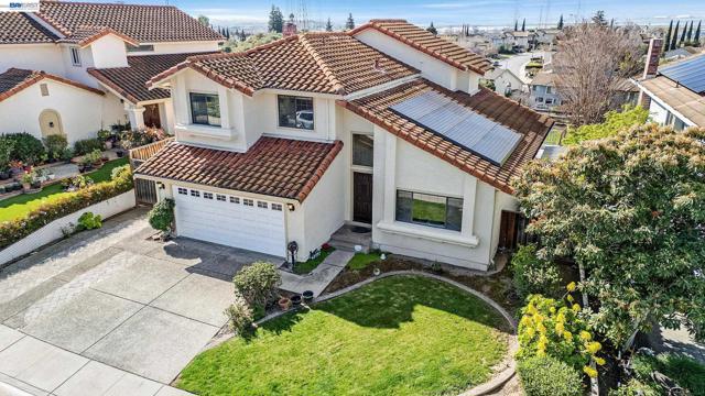 Located in the highly sought-after Mission San Jose area with access to top-rated schools including Mission Valley ES, Hopkins Middle, and Mission San Jose High (buyer to ascertain availability), this desirable northeast-facing home offers sweeping valley views and backs to open hillside space with no rear neighbors for exceptional privacy. Bright and filled with natural light, the home features large windows and vaulted ceilings that enhance the airy interior while capturing scenic views of the surrounding hills and valley. The thoughtfully designed floor plan includes hardwood flooring, a dramatic two-story entry, formal living and dining areas, and a spacious family room with brick fireplace. The remodeled kitchen showcases granite countertops, a large center island, stainless steel appliances including double wall ovens, and an adjoining breakfast nook overlooking the backyard deck. Upstairs, the primary suite features vaulted ceilings, beautiful views, and a private balcony, while the primary bath includes dual vanities, a soaking tub, and separate shower. An expansive multi-level deck provides excellent space for outdoor entertaining while enjoying the panoramic surroundings. Additional features include an owned solar system, central A/C, and 240V outlet for EV charging.