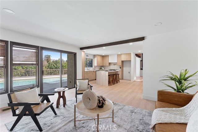 Beautifully updated Redlands home featuring dramatic vaulted ceilings, exposed beams, and expansive windows that fill the living spaces with natural light. The open layout offers a seamless flow between the living, dining, and remodeled kitchen, complete with custom cabinetry, quartz countertops, and a large center island with seating. The spacious primary suite includes a spa-inspired bathroom with a walk-in shower and soaking tub. Enjoy the private backyard retreat with a sparkling pool, patio space, and mature landscaping—perfect for relaxing or entertaining. Reach out today for your exclusive and private tour today.