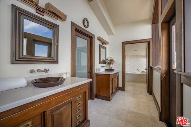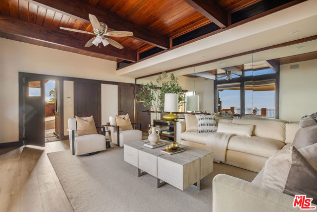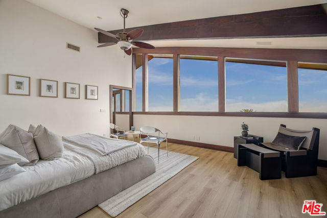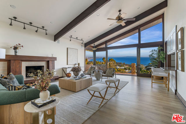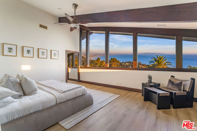 Breathtaking Pacific Palisades estate available for lease, offering sweeping panoramic ocean views from DTLA to Catalina Island, the Queen's Necklace, and the beaches of Malibu. Designed by renowned architect Ray Kappe, this 6-bedroom, 8.5-bath residence sits above the tranquil grounds of Lake Shrine and provides one of the most stunning vantage points in the Palisades.Remodeled in the early 2000s, the home features floor-to-ceiling windows that frame the coastline and fill the interiors with natural light, creating a serene, private environment ideal for both everyday living and sophisticated entertaining. The main level includes a fully equipped cook's kitchen with an open flow into the formal dining area, multiple family rooms, a media/screening room, an exercise studio with an en-suite bath, maid's quarters, and a custom wine cellar with a tasting area. Outdoor living is exceptional, with expansive view decks, a lap pool and spa, and a peaceful setting for sunset gatherings. Two luxurious primary suites showcase dramatic ocean views, while the additional bedroom suites all include private bathrooms. The property is enhanced with an Enphase Solar Energy system, a separate 3-car covered garage, and a 50' x 75' lower parking area accommodating up to seven cars plus an RV. A charming guest house with a kitchenette and bathroom sits below the pool perfect for visitors, staff, or a private retreat. Moments from hiking and biking trails, beaches, and the best of Pacific Palisades, this exceptional architectural home offers a rare opportunity to experience serene, elegant coastal living now available for lease.