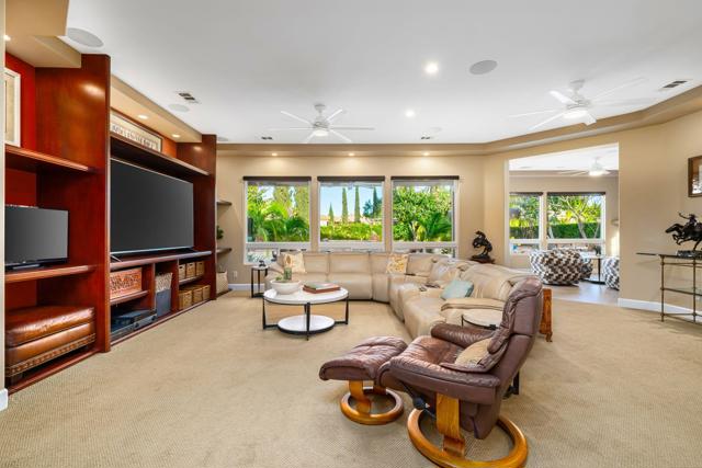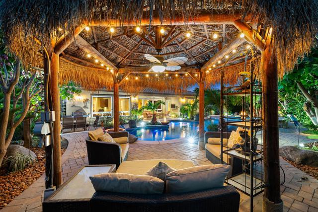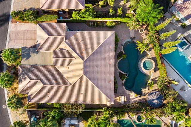 Set on a premium, oversized homesite within the desirable Rancho Santana community and bordering the prestigious Madison Club, this exceptional Plan 4 residence offers a rare blend of privacy, scale, and resort-style living, with beautiful mountain views and no neighboring homes along the northwest side. A gated courtyard entry with Alumawood-covered patio welcomes you into a thoughtfully upgraded home featuring soaring 10-foot ceilings, upgraded 8-foot doors, plantation shutters, custom built-ins, and an open layout designed for both elegant entertaining and comfortable everyday living. The home includes a private attached casita with its own entrance, walk-in closet, upgraded bath, and separate climate system, providing an ideal retreat for guests, extended family, or a private office. Numerous mechanical and convenience upgrades enhance the home, including multiple newer HVAC systems, split systems for individualized comfort, newer water heaters, a whole-house water softener, EV charging capability, upgraded garage door with MyQ controls, extensive storage, and designer ceiling fans throughout. The backyard is truly a private resort, highlighted by a PebbleTec saltwater lagoon-style pool with beach entry and multiple tanning shelves, a dramatic cascading spa with multi-level jets, fire bowls, a raised fire pit, and multiple outdoor entertaining areas designed for gatherings and relaxation. A palapa with lighting, fan, and speakers creates a perfect shaded retreat, while the covered patio, professional landscape lighting, citrus and tropical plantings, raised garden beds, and two outdoor showers add to the resort atmosphere. Paver hardscaping and an expanded driveway that accommodates numerous vehicles complete this exceptional property, which embodies luxury desert living with privacy, comfort, and spectacular outdoor spaces.
