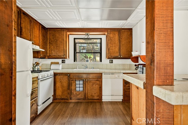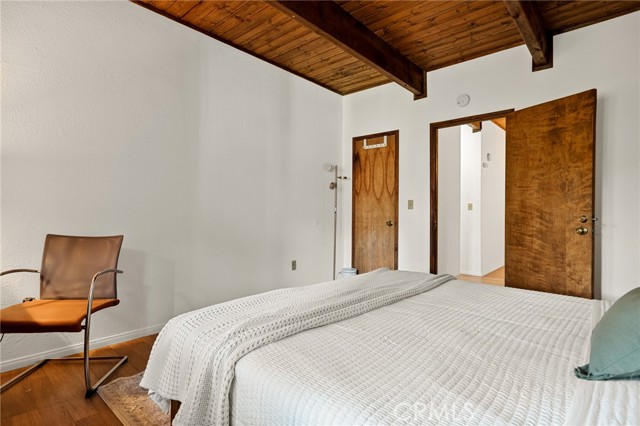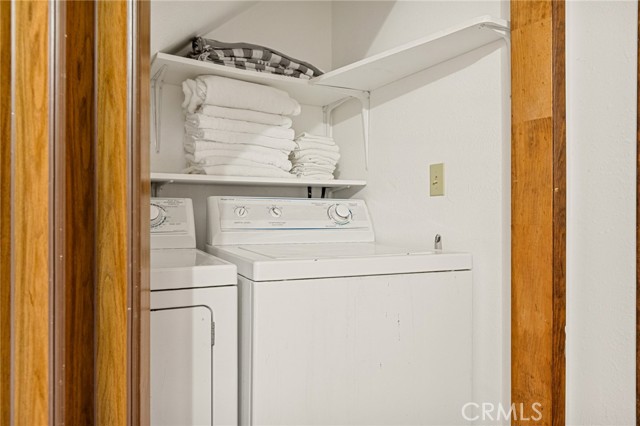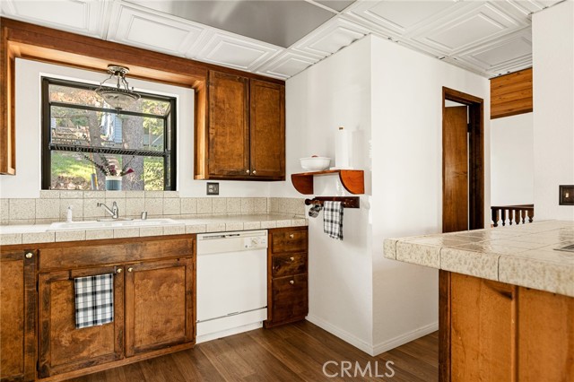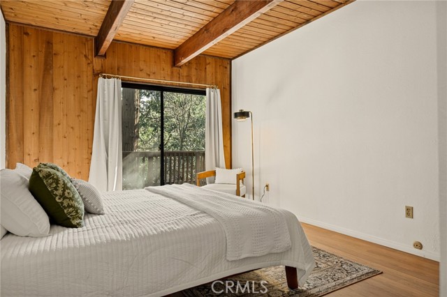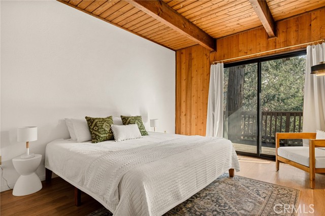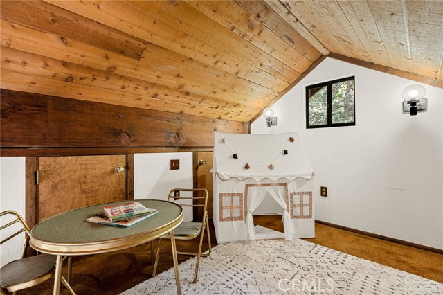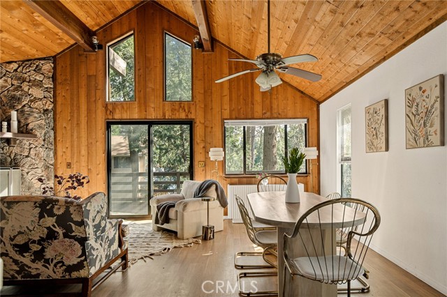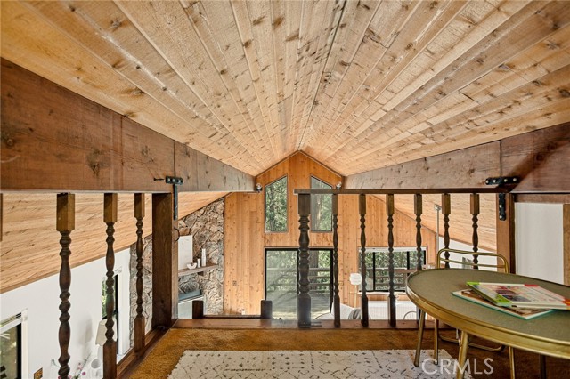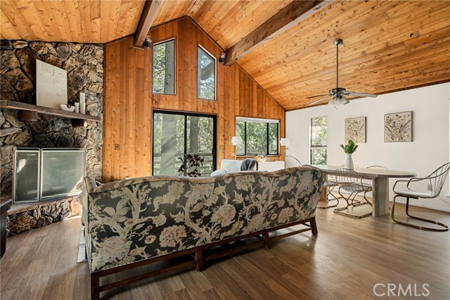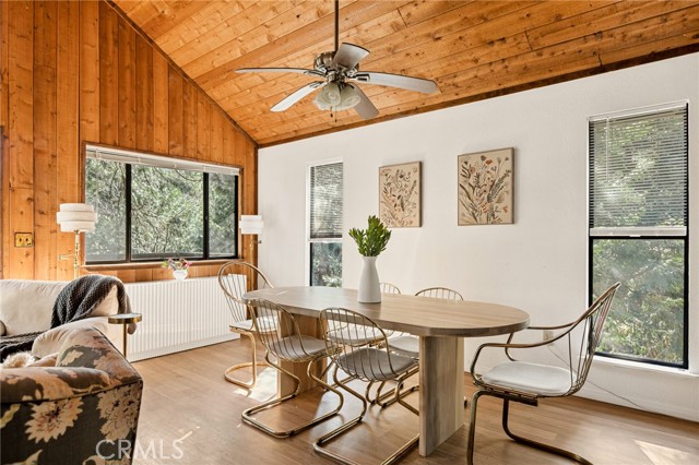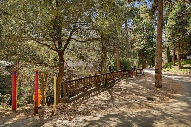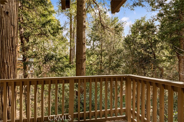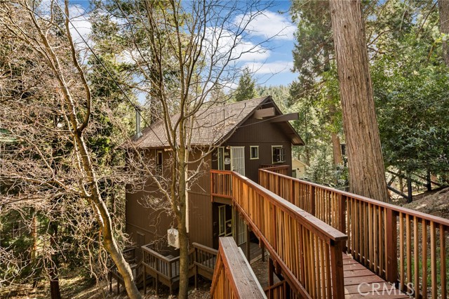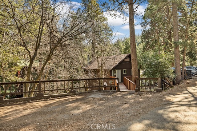 Tucked quietly among the trees, this woodsy cabin captures the essence of mountain living. A spacious level driveway offers plenty of parking, while a charming bridge walkway creates a storybook approach and easy level entry into the home. Inside, the living room welcomes you with soaring vaulted ceilings and a wood-burning fireplace as focal point creating that classic cozy cabin atmosphere. The main level features the living room, dining area, kitchen, and half bath, along with a playful loft space perfect for reading, games, or extra sleeping or storage. A mini-split air conditioning unit ensures comfort year round. A sliding door opens to the upper deck—an ideal spot for morning coffee or relaxing in the peaceful forest surroundings. Downstairs are three bedrooms, a full bathroom, and a convenient laundry closet. One bedroom enjoys access to its own private deck, creating a quiet escape among the trees. The lower level also offers separate entry, providing flexibility for guests or extended stays. Additional storage/ workshop space is available in the buildup area below. Conveniently Located between Top Town and Crestline Village, and less than 5 minutes from glistening Lake Gregory. A moody mountain retreat in beautiful Crestline—full of charm, character, and the peaceful feeling of being tucked away in the forest.