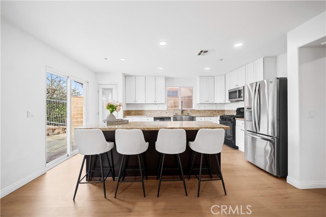 VIEW! VIEW! VIEW! LOCATION! LOCATION! LOCATION! Live and Enjoy this exceptional privacy along with PANORAMIC SIERRA LAKES GOLF COURSE VIEWS and BREATHTAKING SUNSET VISTAS from multiple vantage points. This stunning, fully remodeled TURNKEY HOME features NEW paint, NEW luxury vinyl wood flooring, and NEW recessed lighting throughout. The bright, open floor plan includes 4 BEDROOMS and a dedicated STUDY/READING room. *** The spacious family room is filled with natural light and is ideal for both everyday living and effortless entertaining. The study room at the entrance offers versatility perfect as an OFFICE, LOUNGE, or A potential 5TH BEDROOM. *** The upgraded kitchen features MODERN SHAKER STYLE CABINETS, GRANITE COUNTERTOPS, STAINLESS STEEL APPLIANCES, a LARGE CENTER ISLAND, and a cozy BREAKFAST NOOK. The indoor LAUNDRY ROOM is conveniently located across from the downstairs half bath. ***Upstairs, the large PRIMARY MASTER SUITE overlooks the golf course and showcases sweeping SUNSET VIEWS. The primary bathroom includes a separate shower, dual-sink vanity, and a spacious walk-in closet. The top floor also offers a SECOND MASTER-SIZED BEDROOM, ideal for in-laws, guests, or teens, along with two additional generously sized guest bedrooms. *** The SPACIOUS BACKYARD provides ample seating and unobstructed golf course and sunset views—perfect for relaxing or entertaining. *** Conveniently located near the 210/15 freeway, with COSTCO, LOWE'S, HOME DEPOT, RESTAURANTS, AND SHOPPING CENTERS just minutes away. A rare opportunity to enjoy golf course living with incredible views and true move-in-ready comfort—DON'T MISS IT.