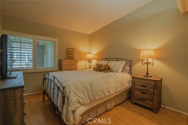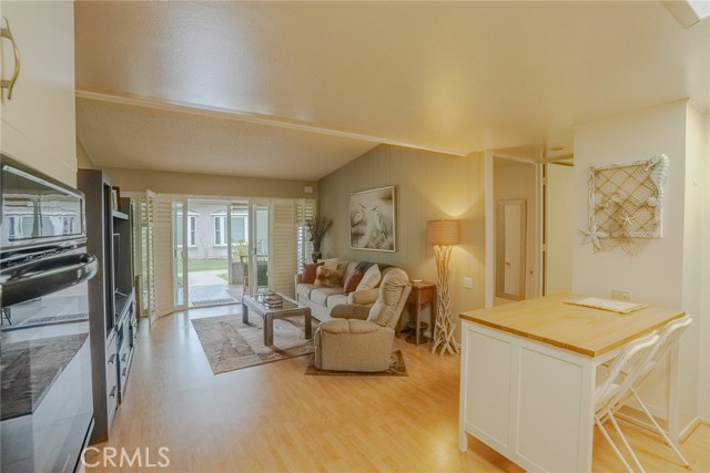 Charming one bedroom, one bath cottage located on a peaceful greenbelt. Features include plantation shutters, double paned windows , laminate flooring, Slider that opens to very private front porch, two skylights that fill the home with natural light, and an efficient heat pump for year round comfort. Mutual 1, Carport 7, Space 22