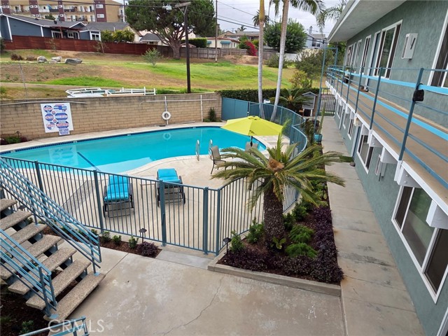 2 Bdrm 1 Bath (upper) apartment (near 7th & Ximeno). Lots of closet space (one walk-in), laminate flooring throughout. Common on-site Laundry room, Swimming Pool and BBQ. Includes stove and refrigerator. Open on-site parking (first come first served basis). I do not have any garages available. Completely remodeled, new cabinets, counters, fixtures, new paint. Clean & Quiet building.