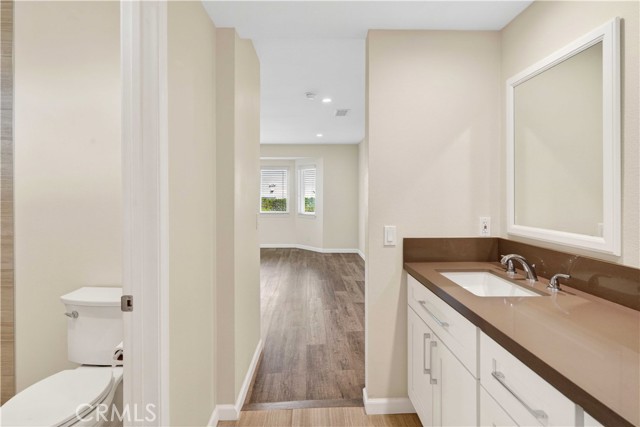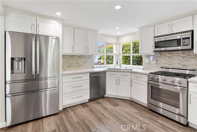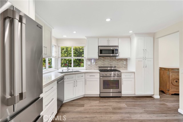 Fabulous Porter Ranch Estates Gem in Guard-Gated Community. Beautifully remodeled two-story home located in the highly desirable Porter Ranch Estates. This charming residence offers 3 bedrooms, 3 bathrooms, and 1,603 sq ft of living space, blending comfort, style, and convenience. The home features a newly remodeled kitchen with crisp white shaker cabinetry, elegant quartz countertops, Dacor stainless still appliances, and modern finishes. Laminate flooring flows throughout the home and fresh interior paint creates a bright and inviting atmosphere. The open and functional floor plan is perfect for everyday living and entertaining. The living room features a cozy fireplace, adding warmth and character. A full bathroom with shower on the first floor provides added convenience for guests. Upstairs you will find the spacious en-suite primary bedroom with views of the backyard. Enjoy the private backyard ideal for relaxing or entertaining. Residents enjoy resort-style community amenities including a pool, spa, tennis courts, and children’s playground. Conveniently located just minutes from Whole Foods, upscale shopping, popular restaurants such as Lure Fish House and Patxi’s Pizza, and a modern AMC theater. FOR LEASE