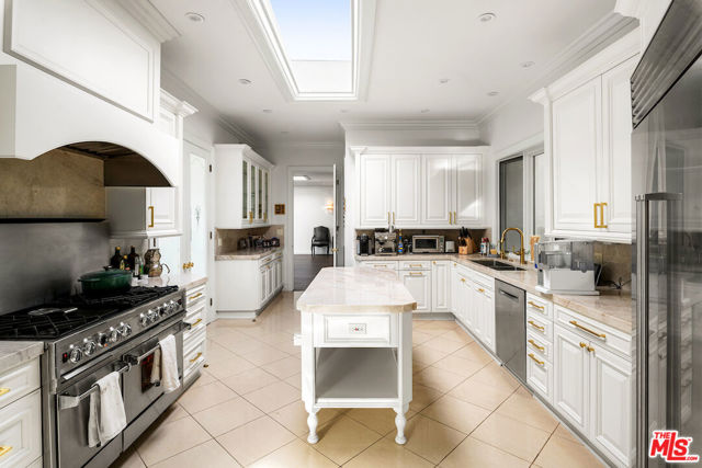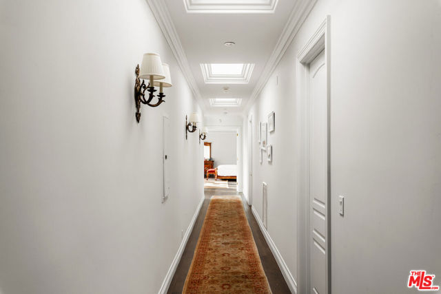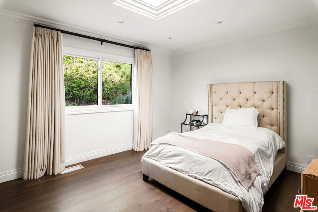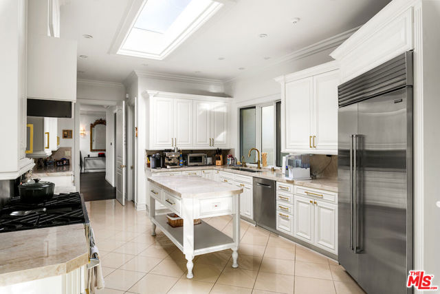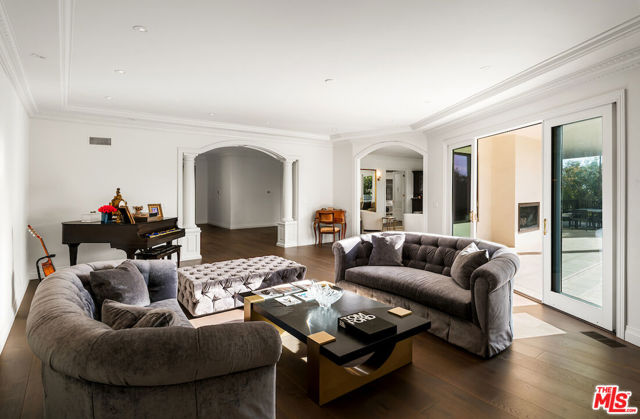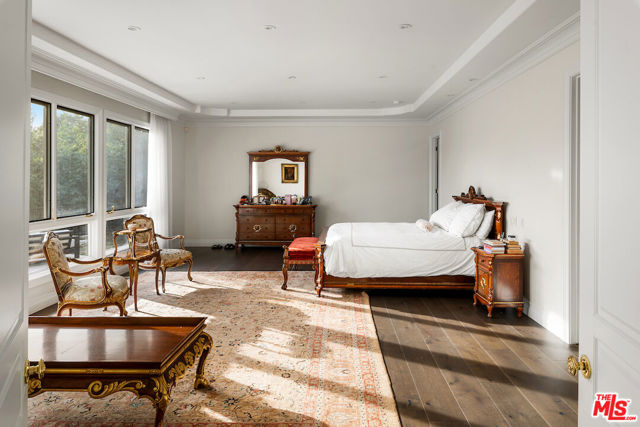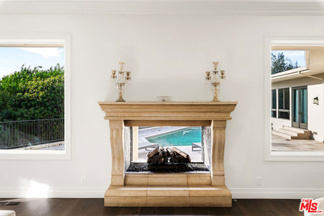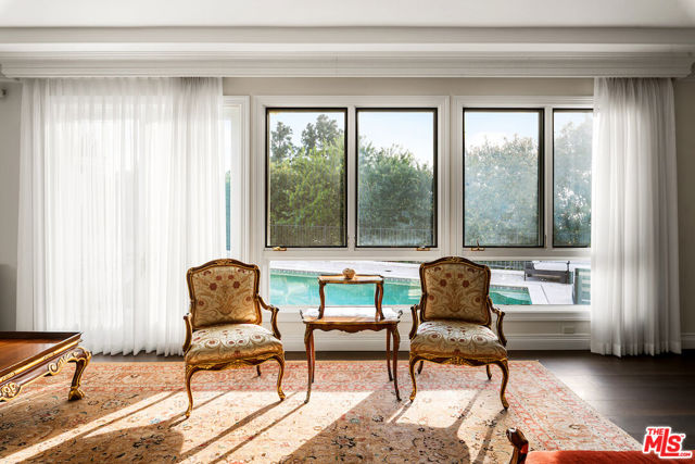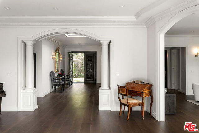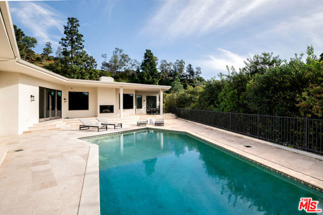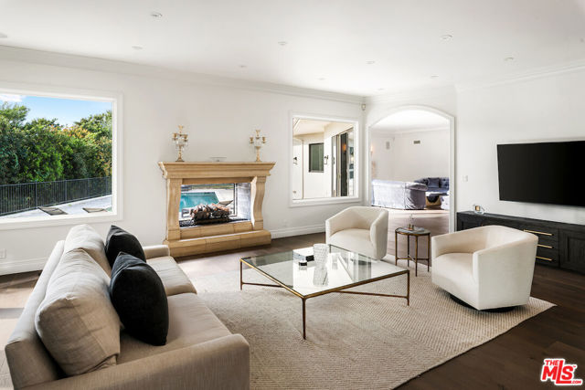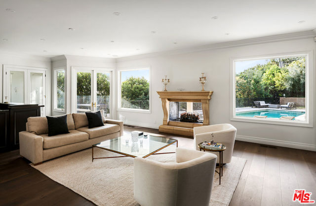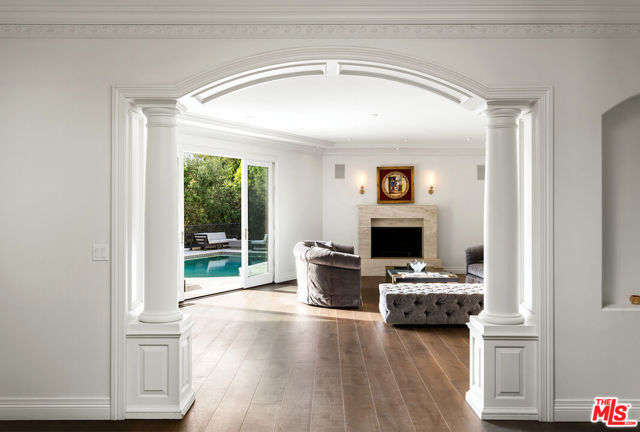 Situated in the prestigious Trousdale Estates of Beverly Hills, this meticulously renovated five-bedroom, six-bathroom residence is intentionally set back from the road and privately nestled behind lush landscaping. Ornate double doors welcome guests into the formal entry, showcasing intricate crown moldings, arched doorways, and a skylight that fills the home with natural light. The carefully curated layout is a true entertainer's dream, featuring two spacious living roomsone with an impressive sunken bar and see-through fireplace, and the other seamlessly integrating indoor-outdoor living through expansive glass sliding doors. The formal dining room is thoughtfully situated just off the chef's kitchen, which is fully equipped with state-of-the-art appliances and a charming breakfast nook. The primary retreat boasts a generous walk-in closet and a luxurious en-suite bath complete with a soaking tub. Three additional bedrooms, all well-proportioned, plus a substantial bonus room provide flexibility for a gym, media room, office, or playroom.An expansive pool serves as the focal point of the outdoor oasis. Enjoy sunny afternoons lounging poolside and dine al fresco beside the outdoor fireplace. An ultra-wide driveway ensures ample parking. The property may be offered furnished for an additional amount.