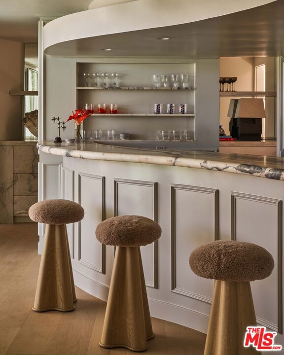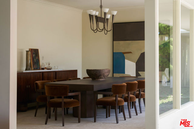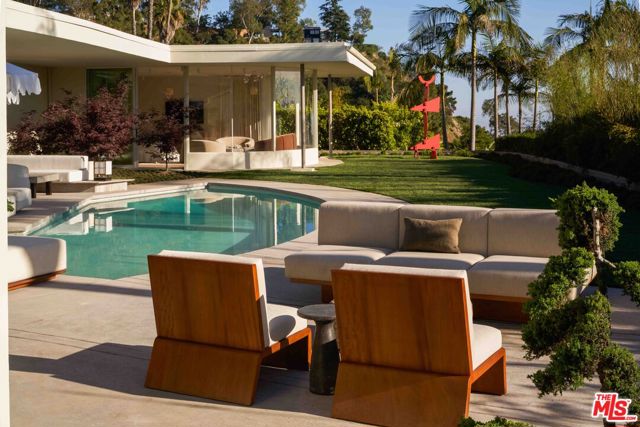 One of the finest mid-century architectural homes in Trousdale, OSKLO House sits on a flat half-acre lot with sweeping views of West LA. Designed by Benton & Parks AIA in 1966 and completely reimagined by OSKLO, this approx. 6,200 SF estate blends iconic design with modern luxury. A dramatic courtyard with a sculptural fountain sets the tone for the fully furnished, turnkey residence. Inside, the living room features an oversized fireplace and floor-to-ceiling windows, creating a striking introduction to the home. Custom OSKLO furnishings, museum-quality antiquities, and curated vintage pieces beautifully complement the rich materials and finishes throughout. No expense was spared. The kitchen embodies classic Beverly Hills living, complete with a breakfast nook, butler's pantry, and a wall of windows opening to the garden. The primary suite, showcasing nearly $1 million in stonework, offers wraparound windows overlooking the backyard and city lights beyond. A long hallway above a Japanese-inspired atrium leads to three ensuite bedrooms, with an additional ensuite near the kitchen and a pool bath by the outdoor cabana ideal for hosting.Outside, the angular pool pavilion includes multiple lounge areas, a swimming pool, fire pit, and outdoor bar, capturing the essence of Trousdale's signature indoor-outdoor lifestyle.