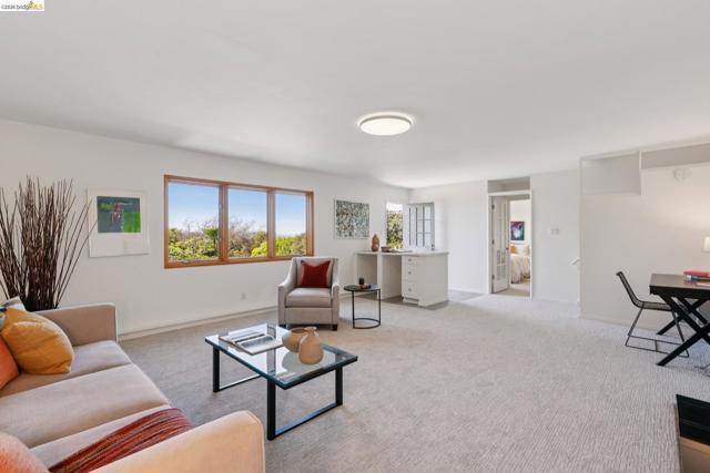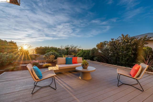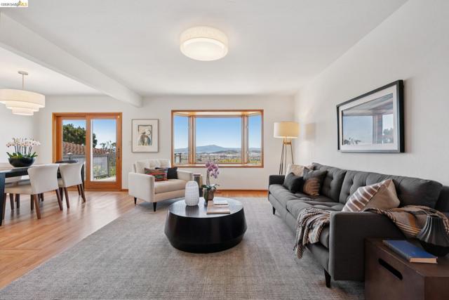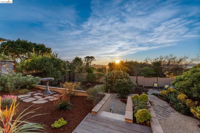 Classic, four-bedroom, two bath, sun-filled mid-century home with stunning panoramic North Bay views, tasteful updates throughout, an exceptionally practical and versatile floor plan, and a glorious backyard. Designed for comfortable, easy living, with a level-in entry, a perfect balance of openness and separation, three bedrooms on the main level, and a two-car garage with interior access. The spacious, light-filled lower level, with a bedroom, full bath, and great room, and both interior and exterior access, is the perfect guest suite, primary retreat, home office, or au pair. Among the home’s highlights is a beautiful and expansive, fully fenced backyard with 2 decks, one a view-deck, off the dining room, with stairs to the yard, and a second, platform-style deck. Groomed but not fussy, the exceptional backyard delights with meandering pathways, patios, fruit trees, grape vines, Calla lilies, rose bushes, mature plantings, and a partial Bay view. Additional features include gleaming hardwood floors, fresh paint in and out, a lovely kitchen, two zone heating and a large basement storage area. Although 2729 Del Monte exudes serenity, it is close to many amenities, including Berkeley Country Club, public transit, AC and BART, Wildcat Canyon Regional Park, and Arlington Market.