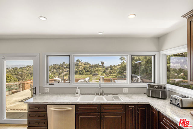 Golf Course & City Views! Perched in a prime Tarzana hillside location near the prestigious Braemar Country Club, this exceptional residence offers panoramic golf course, mountain, and city light views that create a truly remarkable setting for everyday living. Positioned to capture sweeping vistas and vibrant sunsets, the home blends comfort, elegance, and Southern California indoor-outdoor lifestyle. The newly remodeled residence features 3 bedrooms plus a versatile family room and 3 bathrooms, thoughtfully designed with an open and inviting floor plan. A welcoming entry leads to expansive living spaces highlighted by vaulted ceilings with exposed beams, abundant natural light, and large picture windows that frame the surrounding scenery. The living and family areas offer a warm and sophisticated atmosphere, complemented by a fireplace and seamless flow for entertaining. The spacious kitchen is well-appointed with rich cabinetry, stone countertops, stainless steel appliances, and a center island. Large windows and sliding glass doors overlook the golf course and hills, filling the space with natural light while creating effortless access to the outdoor entertaining areas. The primary suite features high ceilings and serene views, offering a private retreat within the home. Additional bedrooms provide comfortable accommodations for family or guests. Step outside to a resort-style backyard designed to take full advantage of the spectacular setting. The expansive patio is ideal for dining and lounging, while the private pool overlooks the lush fairways and rolling hills of the golf course below. The elevated vantage point provides stunning city lights and mountain views, making the outdoor space perfect for both relaxation and entertaining. Located just moments from Braemar Country Club, top-rated schools, shopping, dining, and convenient access to the Westside, this house presents a rare opportunity to own a scenic view home in one of Tarzana's most desirable hillside neighborhoods.