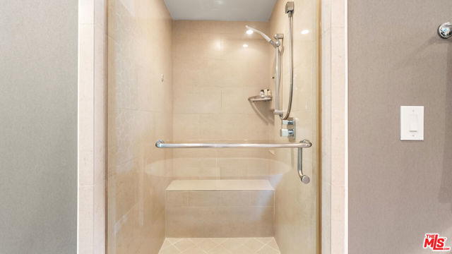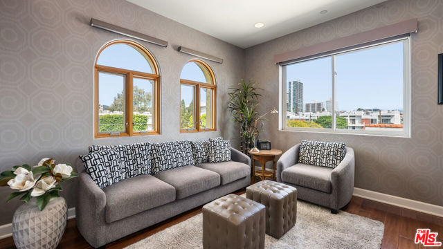 This exceptional "developer's unit" penthouse crowns a newer Mediterranean-style building on a serene, tree-lined street moments from Brentwood and minutes to San Vicente and Montana Avenue. Spanning approximately 1,850 square feet on a single level, this beautifully remodeled 3-bedroom (or 2 + den as it's currently set up), 2.5-bath residence offers sweeping northeast-facing city and mountain views. A gracious double-door entry opens to light-filled living spaces with nine-foot ceilings, rich wood floors, expansive Anderson windows, and imported noise-canceling wallpaper designed to enhance privacy and keep the interiors exceptionally quiet. The living and dining areas are anchored by a custom stone fireplace and flow seamlessly to a generous front balcony. The gourmet kitchen features Viking appliances, a Sub-Zero refrigerator, Caesarstone countertops, and custom cabinetry designed for both elegance and functionality. The tranquil primary suite is a private retreat with its own fireplace, spa-inspired bath clad in Porcelanosa tile, soaking tub, separate shower, and a custom California walk-in closet. A well-appointed guest suite and versatile third bedroom or den complete the interior. Above it all, a spectacular private rooftop deck with BBQ area captures breathtaking 360-degree views from Santa Monica to Downtown LA, an extraordinary setting for entertaining or sunset lounging. Built in 2007, the secure building offers underground parking, guest spaces, low HOA dues, and the only side-by-side parking configuration in the building. Super private and great for entertaining, this penthouse offers a rare blend of luxury and a premier Westside location.