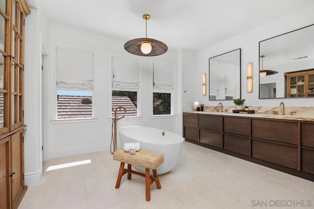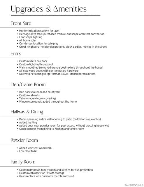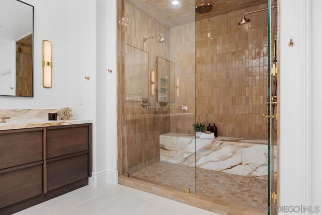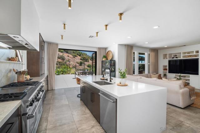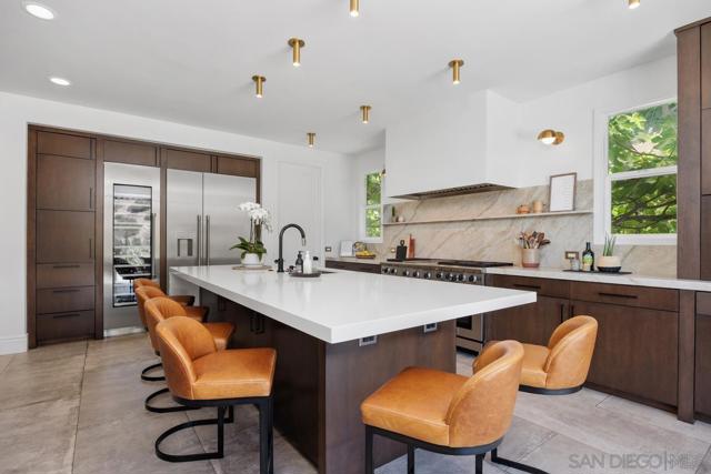 Located on one of the largest and most private lots in San Elijo Hills, this exceptional property backs to serene open space with sweeping greenbelt views. Every inch of this exquisite property has been thoughtfully upgraded with high-end finishes typically reserved for custom-built homes. The backyard is a modern paradise designed for ultimate entertaining. Enjoy a sparkling salt water pool,in-ground Jacuzzi and a fully equipped outdoor kitchen complete with a premium grill,two refrigerators,pizza oven and beer on tap. A stunning Cucina style courtyard fireplace,plumbed for gas or real wood,creates a warm and inviting ambiance for year round gatherings. A gorgeous glass viewing wall spans the backyard, framing the lush backcountry views while maintaining privacy. Inside, the home continues to impress. The custom kitchen,fully remodeled in 2025,showcases Taj Mahal marble,custom french oak cabinetry, a spacious island with abundant storage and quartzite countertops, built in refrigerator, full size wine refrigerator and exquisite custom lighting. The primary bathroom,also remodeled in 2025,is a spa inspired retreat featuring a spacious walk-in family shower, soaking tub, bidet and new designer tile flooring. All secondary bathrooms have been completely renovated, including elegant floor to ceiling tile work, oak cabinetry and Restoration Hardware fixtures. Two sets of panoramic doors allow a fully open floorpan for indoor outdoor living. Simply too many upgrades to list, please see supplemental remarks. A Rare Opportunity to own one of the Finest Homes in San Elijo Hills! An extensive Upgrades List has been included for your review (see final 3 photos). The home features a flexible floor plan including a downstairs en-suite bedroom with California Closet built-ins and a Murphy bed. Upon entering gorgeous iron doors open to the media room with built in oak cabinetry and a second set of iron doors open to the courtyard and Cucina fireplace. This home was designed with the quintessential southern California lifestyle in mind. Open concept living, panoramic door walls for seamless indoor outdoor entertaining, several spaces for cozy family moments, even an outdoor shower and fire pit. New A/C units, new hot water heater and owned solar are just some of the other amenities worth mentioning.