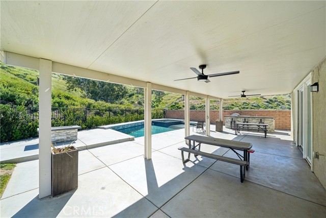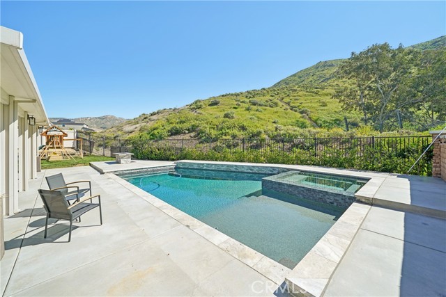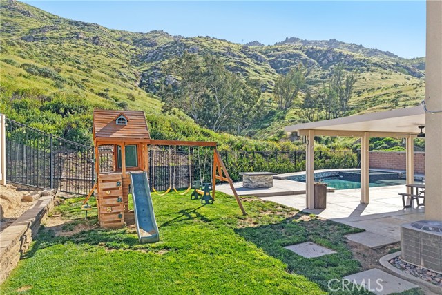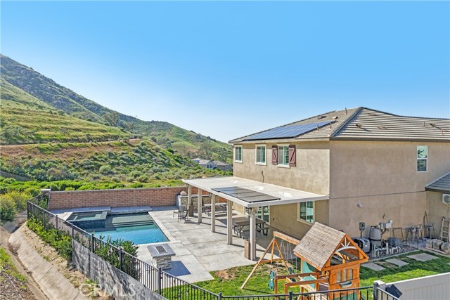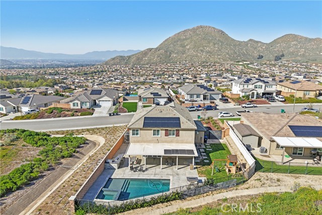 Stunning Upgraded Home in Spring Mountain Ranch! Step inside this beautifully upgraded home featuring soaring 9-ft ceilings, wood-look vinyl floors, plantation shutters, and modern appliances. Your private backyard is a true oasis: no neighbors on the back or left, a heated pool & spa, gas fire pit, BBQ island, insulated patio cover, and breathtaking mountain views. Additional features include owned solar panels, a 3-car garage with epoxy flooring, mini-split A/C, generator-ready switch, and potential RV parking. Perfect for entertaining, relaxing, and living the ultimate Riverside lifestyle!