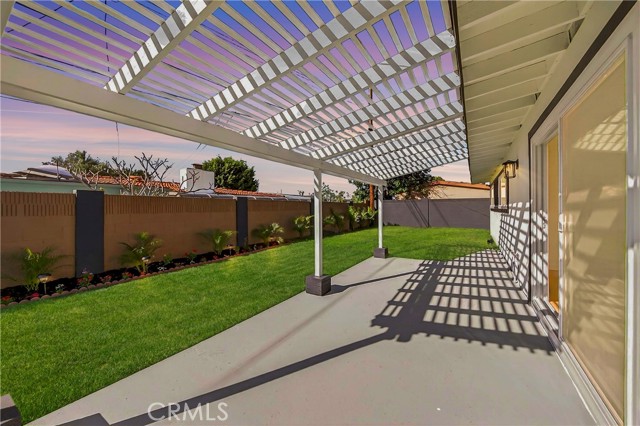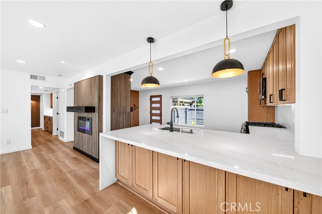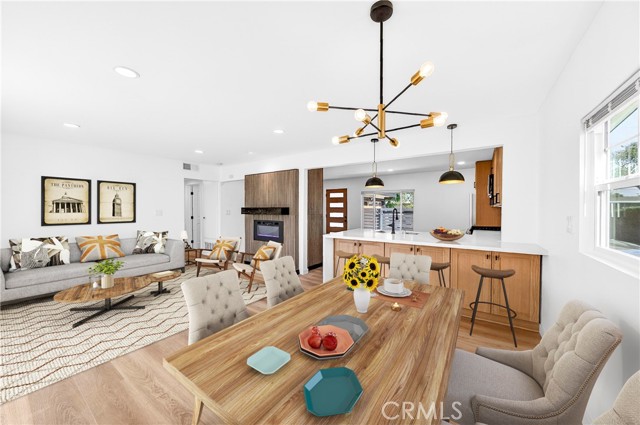 Welcome to this beautifully renovated mid-century modern home located in one of the most desirable neighborhoods in La Mirada, known for its excellent schools and quiet residential charm. The brand-new kitchen features elegant quartz countertops, stylish natural wood-tone cabinetry, and a clean, contemporary design perfect for both everyday living and entertaining. The bathrooms have been completely remodeled with sleek slate-style tile finishes and modern LED lighted mirrors, creating a spa-like atmosphere. The living area features a beautifully upgraded fireplace with trendy tile surround and a dual electric heater, complete with customizable flame colors that create a warm and inviting focal point for the home. Throughout the home you’ll find natural wood-tone vinyl flooring, recessed lighting throughout the entire house, all new dual-pane windows, a new HVAC system (AC and heater), and a new electrical panel, providing energy efficiency and peace of mind. Both the interior and exterior have been freshly painted, giving the home a crisp, move-in ready feel. The primary bedroom is generously sized and includes a connected private bathroom, while the additional bedrooms offer comfortable space for full bedroom furniture and flexible living arrangements. The extended garage has been upgraded with new drywall, recessed lighting, epoxy flooring, and a brand-new garage door with opener, providing a clean and functional space with additional storage. Step outside to enjoy the fully sprinklered backyard, making lawn care easy and ideal for outdoor enjoyment. The home also features a gated front patio for added privacy and security, creating a welcoming outdoor space. This turnkey property combines classic mid-century character with modern upgrades in a prime La Mirada location—an exceptional opportunity you won’t want to miss.