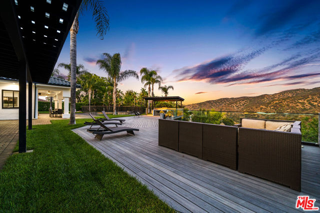 Mulholland Park Estates | Tarzana Luxury Single-Story Estate with Panoramic Canyon Views. Privately positioned behind the prestigious double gates of Mulholland Park Estates in Tarzana, this fully remodeled single-story estate offers a rare blend of architectural presence, modern refinement, and resort-level living.One of only eight custom residences on coveted Ashurst Lane, this exceptional home captures sweeping panoramic canyon and mountain views while delivering the ease and elegance of single-level design a highly sought-after offering in the Tarzana luxury real estate market.Recently reimagined with a fresh, contemporary aesthetic, the home balances clean modern lines with timeless grandeur. Soaring ceilings, expansive entertaining spaces, and walls of glass frame the natural landscape beyond, creating seamless indoor-outdoor California living.The thoughtfully designed floor plan features 5 spacious bedrooms and 7 bathrooms, including a luxurious primary suite retreat with spa-inspired bath and serene views. The chef's kitchen anchors the home with custom cabinetry, premium appliances, and effortless flow into both formal and informal living areas.Outdoors, the property transforms into a private resort oasis. An expansive pool and spa overlook rolling canyon vistas, while multiple lounging and dining areas create the ultimate entertainer's setting ideal for sunset gatherings or quiet mornings surrounded by nature.Additional highlights include a formal living room, formal dining room, executive office, and multiple gathering spaces designed for both grand-scale entertaining and intimate everyday living.Located within one of Tarzana's most exclusive guard-gated communities, this rare single-story estate represents an opportunity to own a fully remodeled luxury residence in Mulholland Park Estates where privacy, security, and elevated design converge.