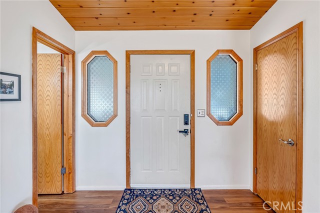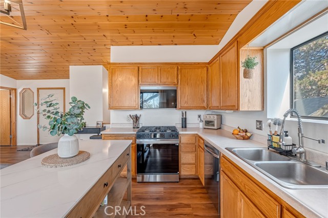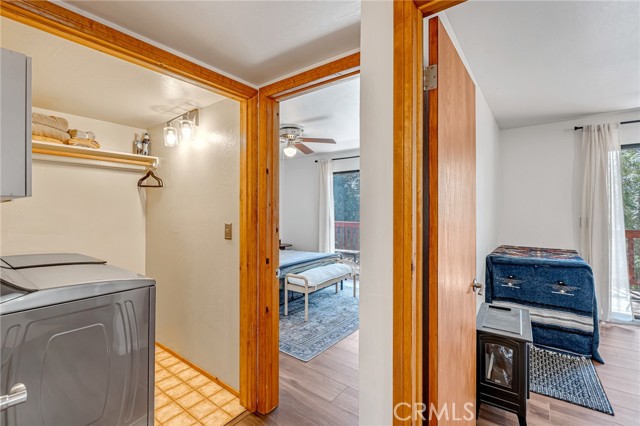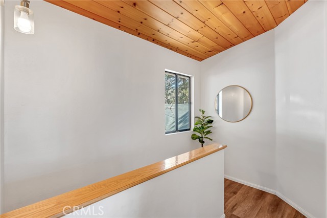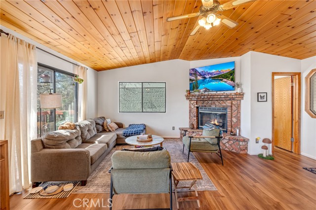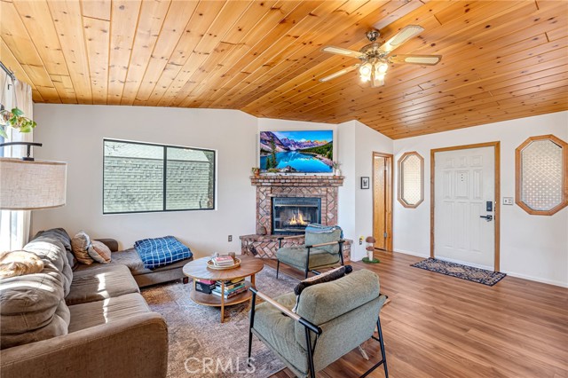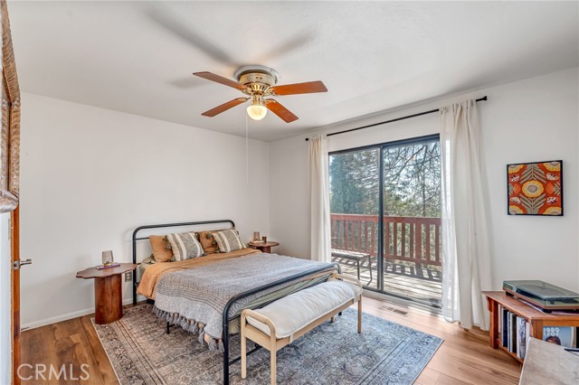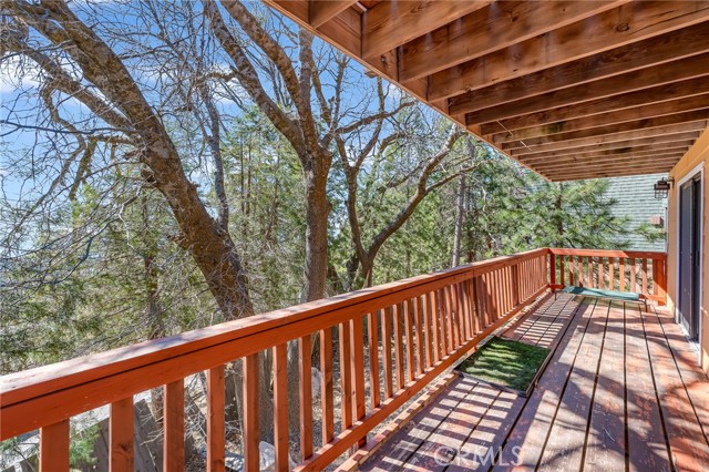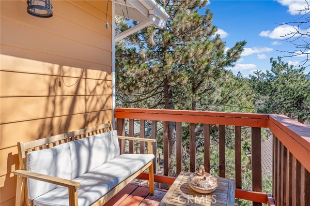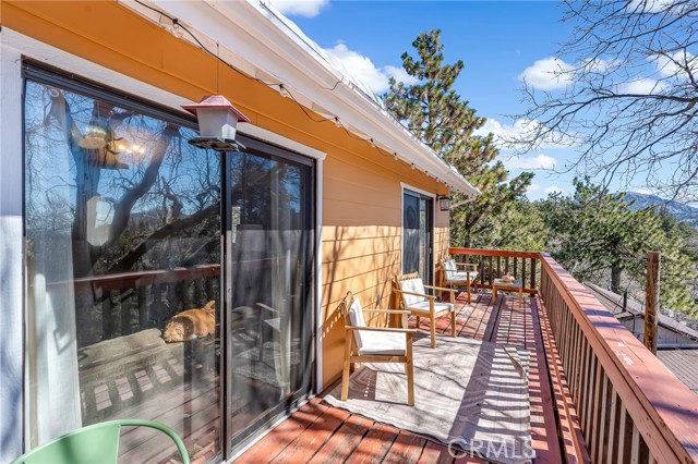 Let the sunshine in!!! This immaculate and cozy home is the essence of sunshine, with its light and bright rooms, and the many balconies that bring the outside in. Start your tour by parking on the generous two-car parking deck that gives you the flat, off-street parking that's so desired in the mountains, then walk into this cheerful, sunny home. Enter the cozy living room, and picture yourself curled up by the gas fireplace on a snowy day, or throwing open the custom drapes and blinds, and letting in the fresh mountain air. Smell lilacs on the breeze, and listen to the many songbirds that are right outside your windows. View many upgrades as you walk on the beautiful wood floors that run throughout the entire house and take a look at the chef's kitchen! You'll see new stainless steel appliances, and the cutest little quartz bar ever. Also included is a Moen automatic water shutoff meter that monitors potential. There's even a half-bath, that couldn't be more convenient! Beamed ceilings throughout the main level give the living room and kitchen a stunning rustic touch, making you truly feel like you're in the mountains. Be sure to open the large sliding doors that lead out to the balcony, where you'll see inspiring mountain views and captivating city lights at night. The generous deck allows company to flow inside and out with ease, making the entire main level open and ready for entertaining and lively conversation. Downstairs, you'll find two generous bedrooms, each with cedar-lined closets, and its own balcony. Imagine waking up and walking just steps to a private little sanctuary, where you can sip your coffee in peace and reflect on the day ahead. Also on the lower level is a full bath with a shower, tub, and Toto (seriously, look it up!) toilet, and the most darling little laundry room that you could ask for. Practically speaking, you'll love the interlock kit that's been installed, allowing you to plug a generator straight into the house, ensuring that your home will stay safe and warm. This property is in a perfect, central location, far enough away from the busy ski traffic, yet minutes away from Snow Valley. Also within easy distance are Lake Arrowhead, with its bohemian restaurants and shops, and the bustling slopes of Big Bear. You really have to tour this sunny, happy house to not only see, but feel the "good vibrations!”