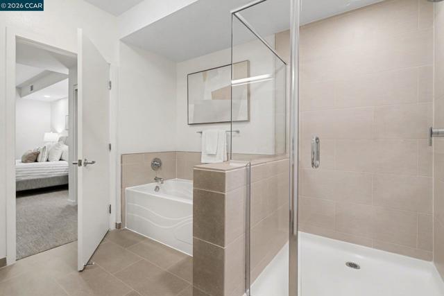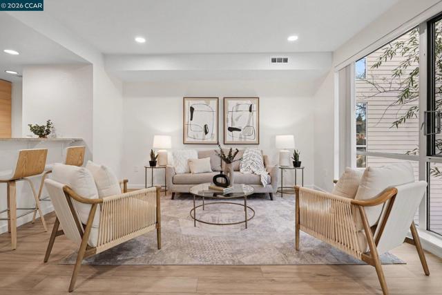 A sought-after floor plan at The Mercer featuring a spacious living room with a cozy gas fireplace, a separate dining area large enough for a round table, and a versatile den. Facing west, the home enjoys filtered afternoon light throughout. Extensive February 2026 upgrades make this residence feel truly move-in ready: new luxury vinyl plank flooring in the entry, den, dining, and living areas; new textured bedroom carpeting; fresh designer white paint; refurbished kitchen and bath grout; a new dining light fixture; and newly permitted recessed lighting in the living room and primary bedroom. The open kitchen includes a Sub-Zero refrigerator, Bosch dishwasher, microwave, gas range and oven, and stone countertops—ideal for everyday cooking or entertaining. The primary suite offers large windows overlooking bamboo and a spa-like bath. Residents enjoy outstanding amenities including a lap pool, spa, fitness center, BBQ area, and lounge. Located in the heart of Walnut Creek, you’re just steps from dining, shopping, transit, and the renowned Lesher Center for the Arts. Not to be missed!