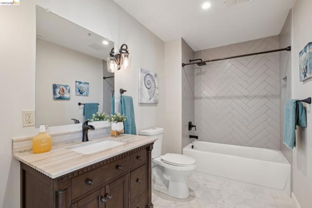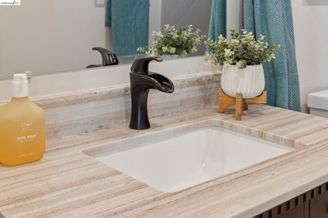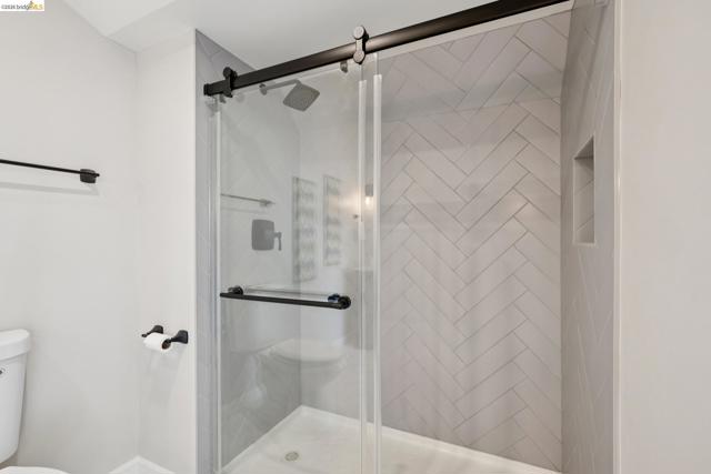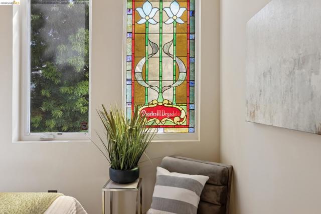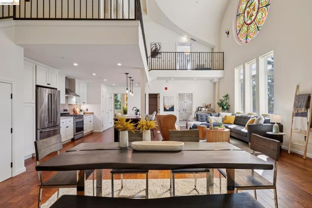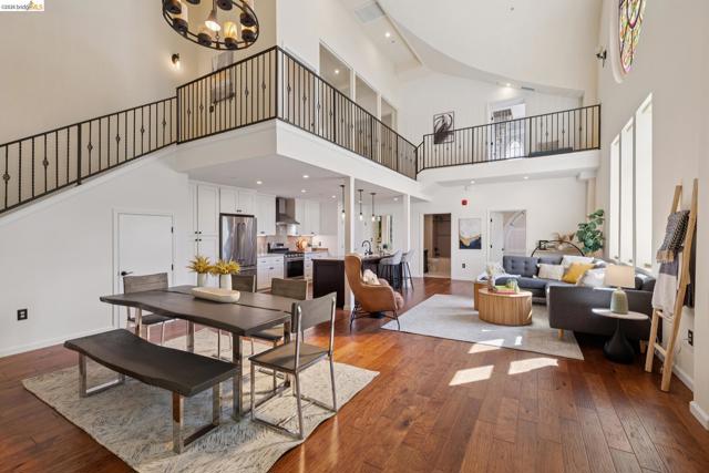 This distinctive condominium is part of a dramatic church conversion in the heart of Bushrod. Soaring ceilings and original stained-glass windows fill the home with natural light, blending historic character with modern design. The open kitchen features a substantial butcher-block island and contemporary finishes, flowing into generous living and dining areas. Two bedrooms and a full bath are located on the main level, while the upper level offers a spacious primary suite, a bright bonus workspace with a wall of glass, and access to a private rooftop deck. Gated parking, in-unit laundry, storage, and secure package delivery add everyday convenience. Walk Score 92 with easy access to Rockridge, Elmwood, and BART.