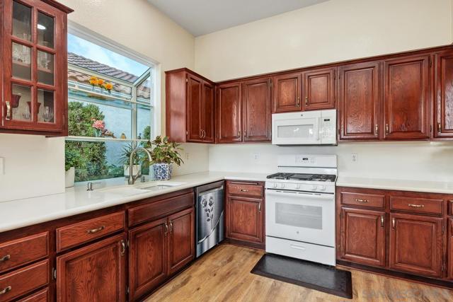 Welcome to your dream home in Lake San Marcos, featuring a lovely Brighton model in The Fairways with panoramic ocean, sunset views from the rear patio, living room and kitchen. The single story has 3 bedrooms, 2 full baths, 2- car attached garage and is situated on a private cul-de-sac. It was upgraded in 2022 with luxury vinyl flooring, quartz counter tops, recessed lighting, newer plumbing in walls, the open atrium was enclosed adding 128 sq. ft to the former interior square footage, for a dedicated dining room, which could be converted to another bedroom, remodeled both bathroom showers, designer paint inside and out, and refreshed landscaping. The flowering perennials create a magical, relaxing space outside for entertaining. The interior cathedral ceilings and skylights allow natural light to pour inside all day long. Schedule your private tour today to start living an exceptional life style at Lake San Marcos. As a resident of The Fairways, you enjoy low HOA fees that include a 24-hour security detail, access to a heated community pool and spa and club house. Also you can join the Lake and Lodge membership to have access to pickle and paddle ball and tennis courts, 2 additional pools, lawn area by lake and Amalfi restaurant, and 2 golf courses. Schedule your private tour today to start living an exceptional life style at Lake San Marcos.