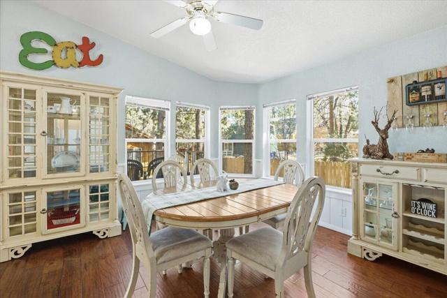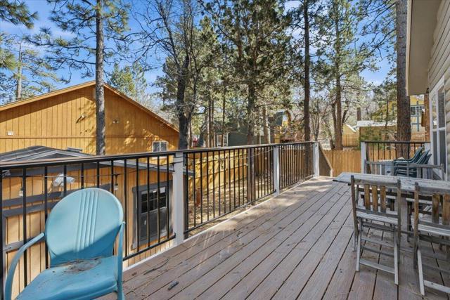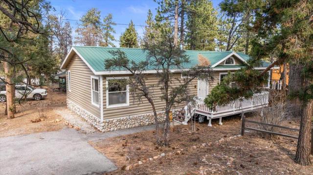 Beautiful log-style 3 bed, 2 full bath mountain home on a spacious, tree studded lot near the national forest! Light, bright, and inviting interior featuring a fantastic open floor plan, cozy living room with a fireplace, formal dining area, and a convenient laundry room. The gorgeous primary suite offers a spa-like bath with a relaxing soaking jet tub. Additional highlights include forced-air heating and a durable metal roof for peace of mind. Enjoy outdoor living on the large south-facing front deck and east facing back deck, great for morning sun and afternoon lounging. The fenced, level backyard provides ample space to play, entertain, or store all your mountain toys--surrounded by beautiful pine trees. Tons of parking and easy year-round access. Located just a block from the forest and only minutes to Big Bear Lake, ski slopes, hiking trails, and shopping. A fantastic price for a move-in-ready mountain retreat. Must check it out!