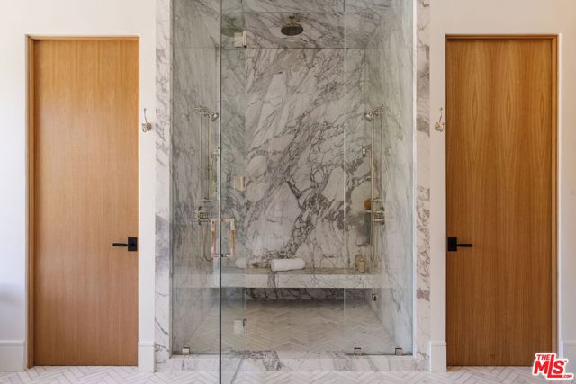 Set on an expansive three-quarter-acre lot, this newly finished Traditional estate is a masterpiece of scale and sophistication. Spanning nearly 11,000 square feet, every detail has been thoughtfully crafted to balance elegance with livability. From lavish entertaining spaces to intimate corners for everyday comfort, the home effortlessly merges classic design with contemporary luxury. The formal living room, centered around a striking marble fireplace and wine bar, flows gracefully into the dining room, where a retractable glass wall creates a seamless connection to the outdoors. The chef's kitchen is a vision of refinement, featuring marble countertops, Sub-Zero and Wolf appliances, and a coffee bar. It extends into the family room, complete with a wet bar, and opens to a covered outdoor deck-creating an effortless setting for entertaining. The main level also includes a private office, guest suite, and elevator providing convenient access to both floors. Upstairs, five ensuite bedrooms offer tranquil retreats, highlighted by the primary suite with a sun-filled private balcony and a spa-inspired bath featuring a steam shower, soaking tub, and generous dressing areas. Additional amenities include a gym, lounge, home theater, and both first- and second-floor laundry. The estate's outdoor spaces are designed for resort-style experience anchored by a sparkling pool and spa, a sport court, and a heated entertaining pavilion, complemented by an outdoor kitchen, firepit lounge, and impeccably manicured lawns-all embraced by mature hedges for ultimate privacy. A detached two-story guest house offers exceptional versatility, featuring a living room, kitchenette, powder room, and an upper-level bedroom suite with a private balcony-ideal for visiting guests, staff, or creative use. Enhanced by a state-of-the-art home automation system, three-car garage, and charming cobblestone motor court tucked behind private gates, this Brentwood estate is a rare expression of timeless elegance and contemporary luxury.