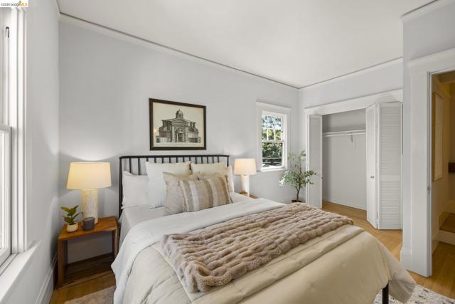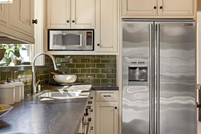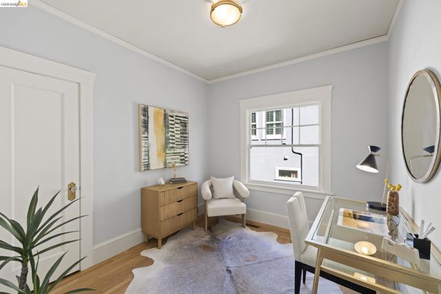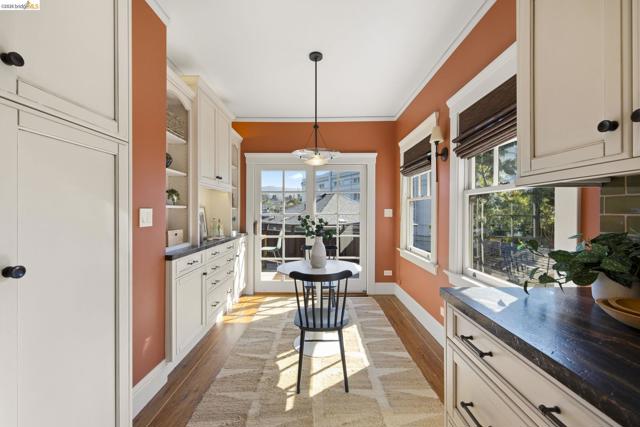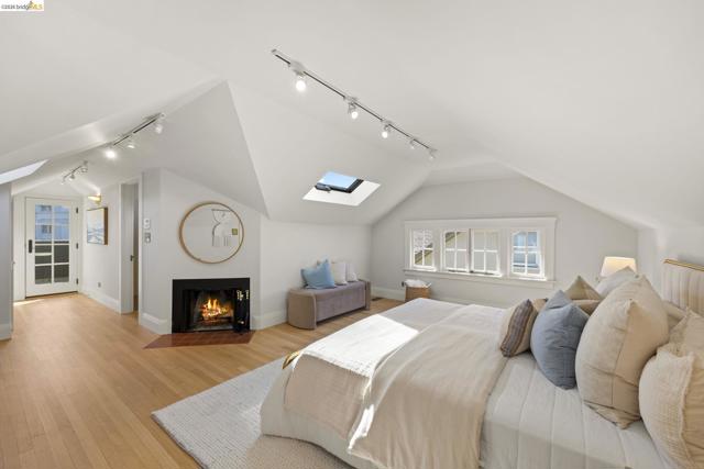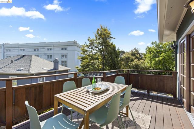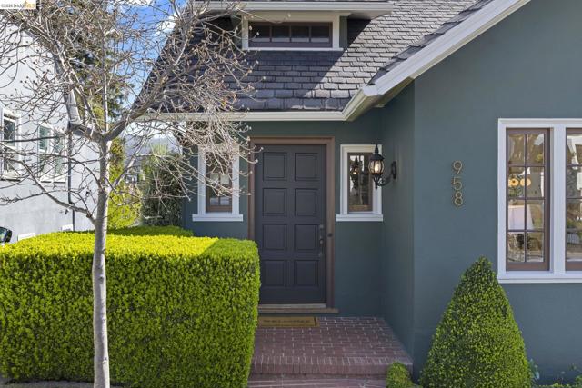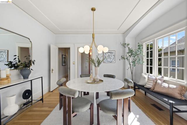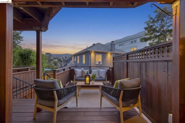 Lovely Crocker Highlands Craftsman bungalow featuring 64 panes of glass spanning the front façade & offering wonderful curb appeal. Inside, a glorious gas fireplace anchors the living room beneath elegant tray ceilings & sits adjacent to the well-proportioned dining room. A kitchen renovation by Mueller Nicholls makes the space a true epicurean delight, featuring weathered stone countertops, a designer subway tile backsplash, custom cabinetry, & a breakfast nook w/sliding doors that open to the spacious rear view deck. 3 bedrooms & a renovated bath w/artisan tile complete the main level. Upstairs, the primary suite includes a decorative fireplace, a pristine full bath w/skylight, & rich ombre shaded tile. An exclusive private balcony offering neighborhood vistas, ideal for morning coffee, completes the upper floor. The lower level, w/ample storage, workshop space, & direct garage access, completes the interior of the home. Private rear gardens, perfect for play & entertaining, feature grassy areas, mature landscaping, & a modern water feature centerpiece. This meticulously maintained home sits just minutes from award winning Crocker Highlands Elementary, the shops & restaurants of Lakeshore Avenue, Lake Merritt, the Saturday Farmers Market, & the Bay Bridge to San Francisco.