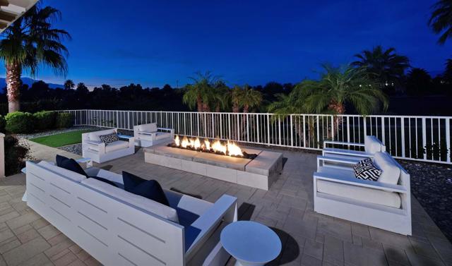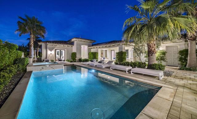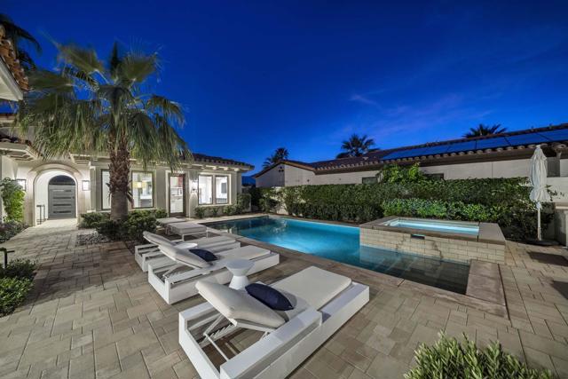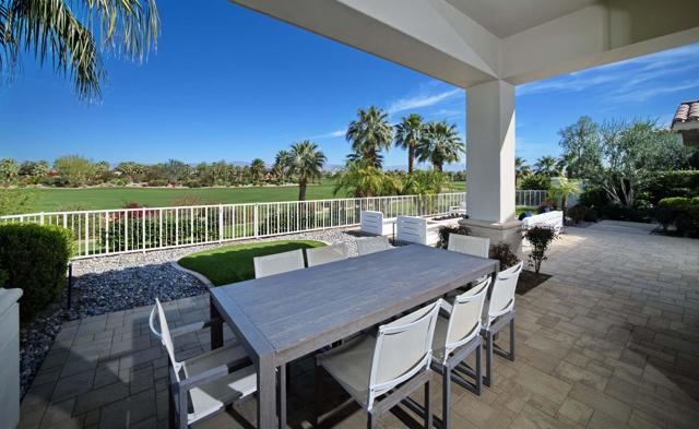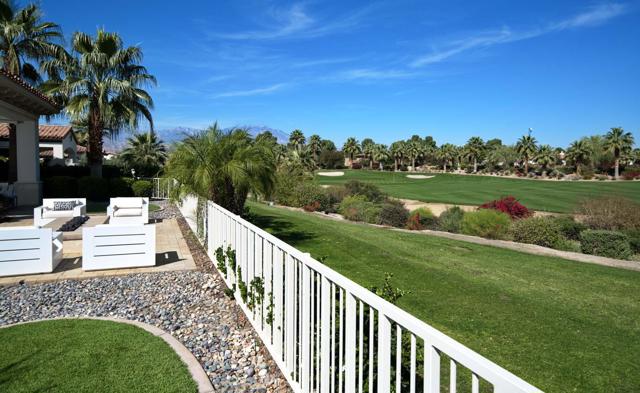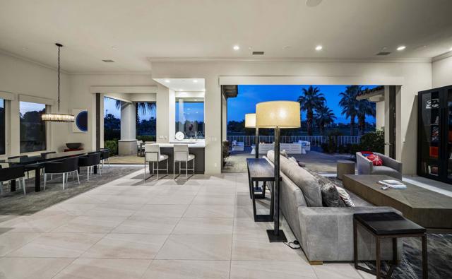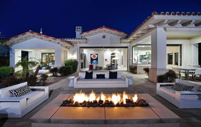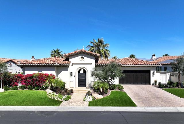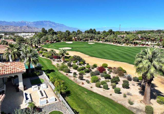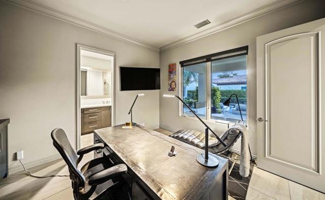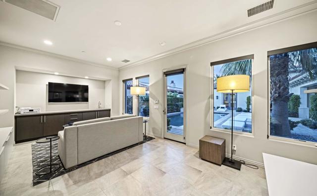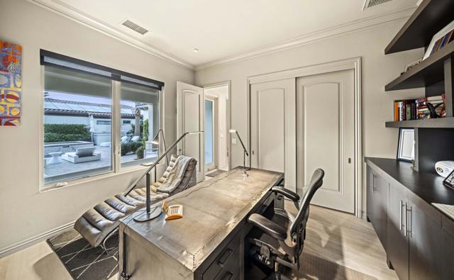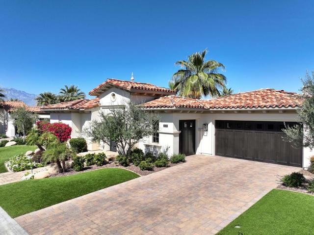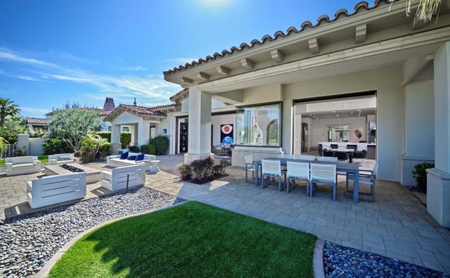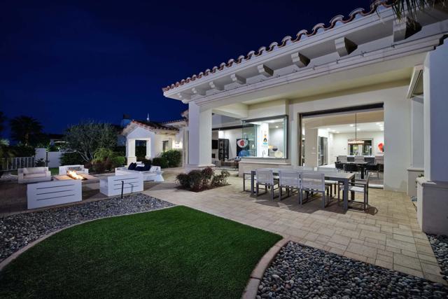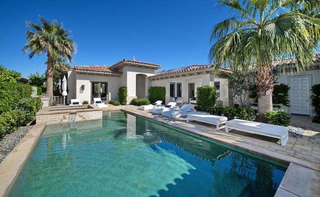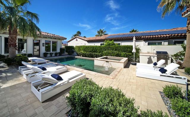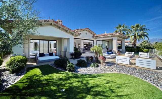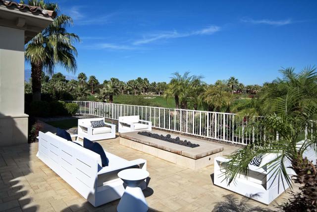 Perched along the 17th hole of the Jack Nicklaus Signature North Course at Toscana Country Club, this beautifully appointed residence captures sweeping views of the fairway, mountains, and tranquil desert surroundings. Thoughtfully enhanced with numerous upgrades and designer touches, the home offers the perfect blend of luxury, comfort, and effortless desert living.Inside, the light-filled open floor plan is designed for seamless indoor-outdoor living, with expansive pocket doors that open to the outdoor entertaining spaces. The great room flows effortlessly into the gourmet kitchen, featuring premium appliances, abundant storage, and thoughtful customizations including added electrical outlets within pantry and kitchen shelving, as well as discreet drawer outlets in the primary bath for appliances and grooming essentials. The home office showcases custom built-in shelving, creating a polished and functional workspace.The outdoor living areas are equally impressive, with upgraded landscaping designed for beauty and efficiency. Artificial turf, decorative rock, and enhanced plantings reduce water usage while maintaining a lush desert aesthetic. The backyard features a newer outdoor grill, newly-installed pavers for easy maneuverability, upgraded lighting along the walkway and exterior sconces, and a refreshing misting system by Modern Misting--ideal for enjoying warm desert evenings overlooking the course.The detached casita offers exceptional flexibility, complete with a California Closets Murphy bed and built-in office space, additional storage, and a sofa that converts to a queen bed--perfect for hosting guests in comfort and privacy. Additional upgrades include solar panels installed in 2018 for significantly reduced energy costs, a whole-house water purification system, Moen emergency water shutoff system to reduce insurance costs, Desert Window Treatments screens and shades, custom iron front door and side gate by Tremblay Iron Works, a dog fence, garage studio with half-split A/C, and freshly painted exterior in 2024.With high-end furnishings--many from Restoration Hardware--and a long list of thoughtful enhancements throughout, this exceptional golf course home offers refined style, modern convenience, and the ultimate Toscana lifestyle.