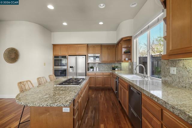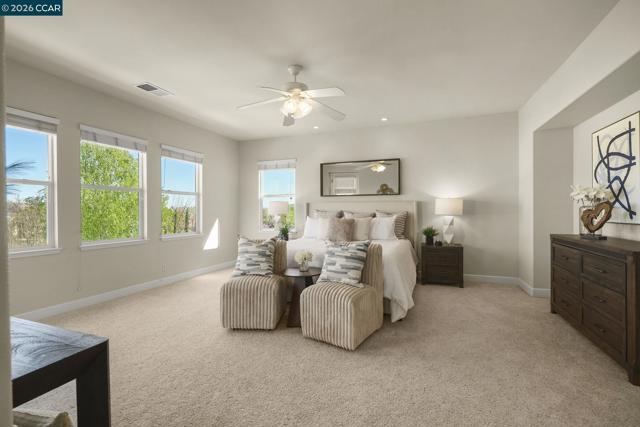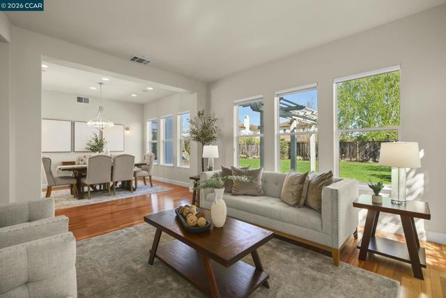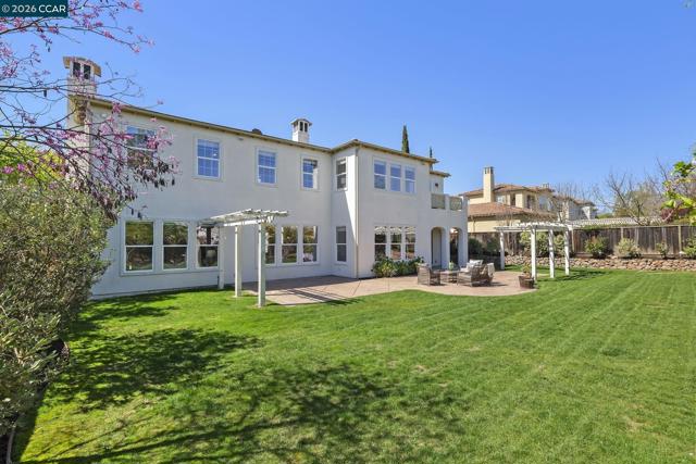 Spectacular Floor Plan, Lot & Location. Spacious home has 4079 sqft with 5 bedrooms and 4 ½ bathrooms. PLUS large bonus room on 1st level, PLUS office with view on 2nd level. PLUS courtyard and two balconies Large flat lot is 10,750 sqft. Open living/dining room has wood flooring & fireplace. Gourmet kitchen features brand new double oven & wine cooler. Kitchen opens to family room with fireplace. Primary bedroom has walk-in closet, jetted tub, and balcony with Mt Diablo view. Guest suite on main level is tucked away in a quiet & beautiful space. Near main park with play structures, tennis, basketball, baseball and soccer. Low HOA dues only $40 per month includes community swimming pool.