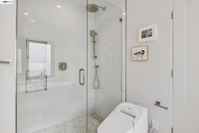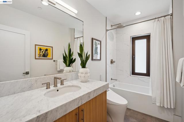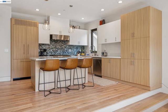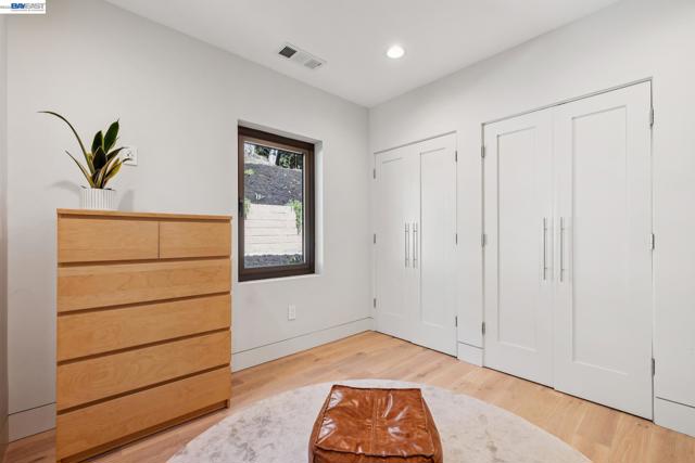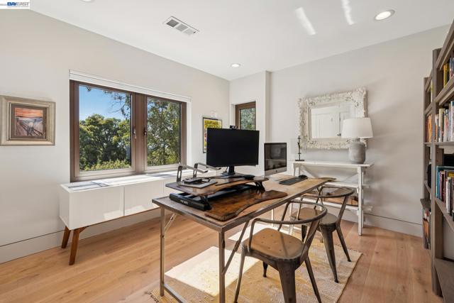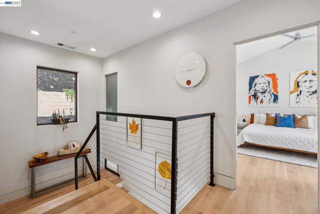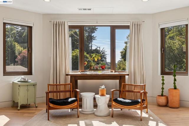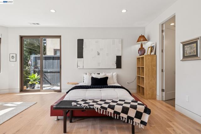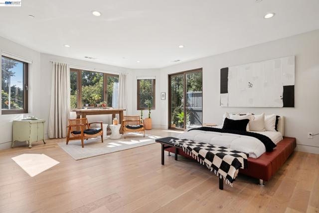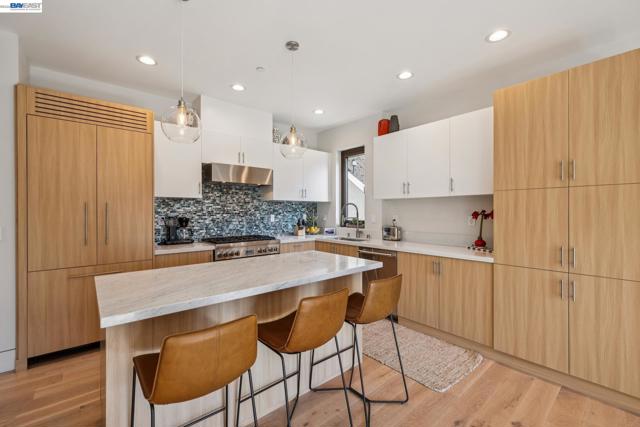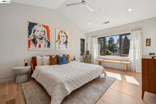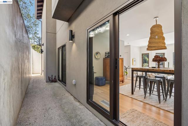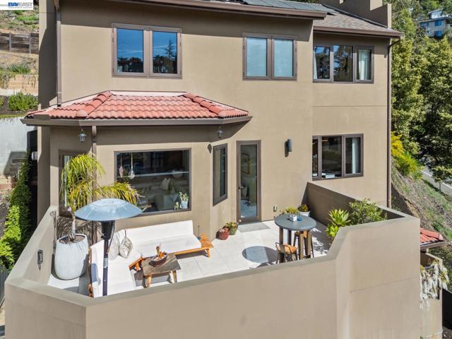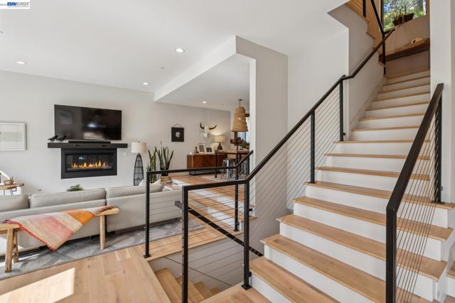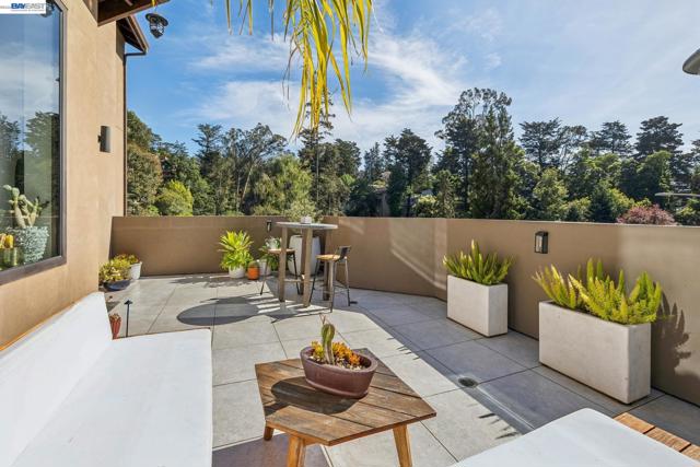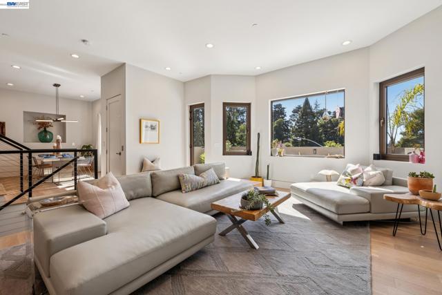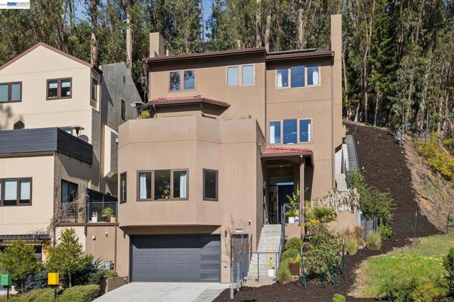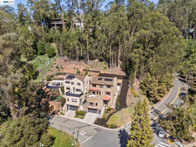 Exquisite contemporary in the sought-after Piedmont Pines neighborhood of the Oakland Hills. Built in 2021, this modern home offers sophisticated design, luxurious finishes, & seamless indoor-outdoor living surrounded by the natural beauty of the East Bay hills. The home features 4 bedrooms & 3.5 bathrooms across multiple levels. The entry level includes a spacious en suite bedroom-ideal for multigenerational living, office, gym, or studio. With its own entrance, patio, & pre-installed plumbing & electrical for a future kitchen, the space also offers ADU potential. The main living level features a chef’s kitchen with premium appliances, built-in refrigerator, designer backsplash, & a large island that flows into the dining area. The living room with gas fireplace opens to a balcony overlooking treetops, perfect for outdoor dining. A BBQ patio & bonus family room provide additional entertaining space. The primary suite offers dual vanities, soaking tub, stall shower, & spacious closets. Additional highlights include a 2-car garage with workshop area, EV charging, elevator access, smart home technology, 3-zone climate control, tankless water heater, & owned solar. Conveniently located near Montclair Village, schools, parks, & Highway 13 & 24. One percent closing cost credit!