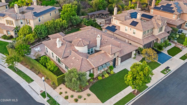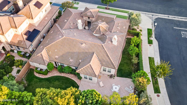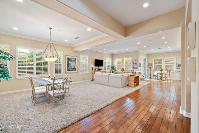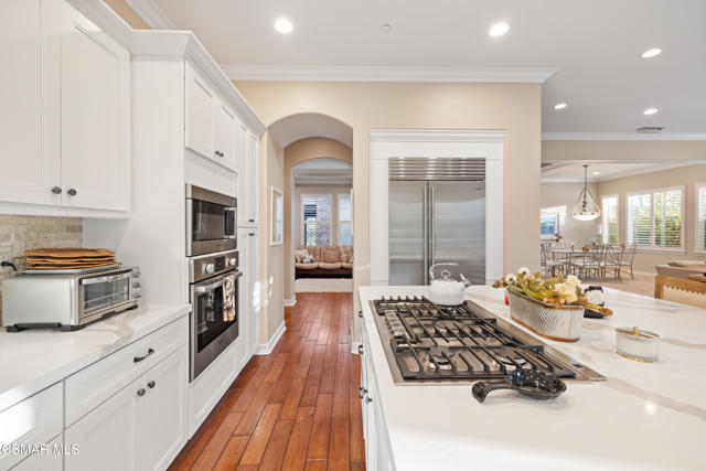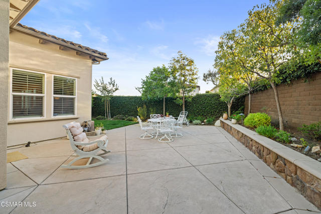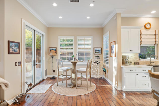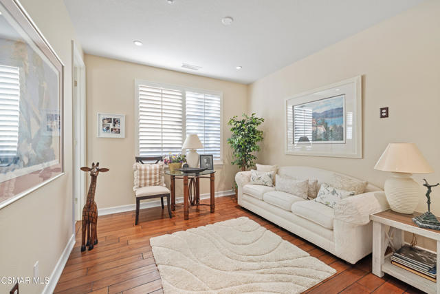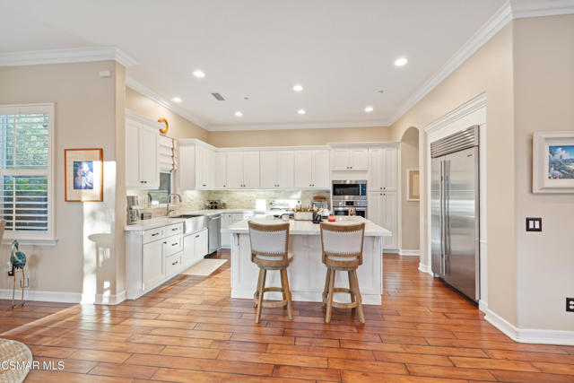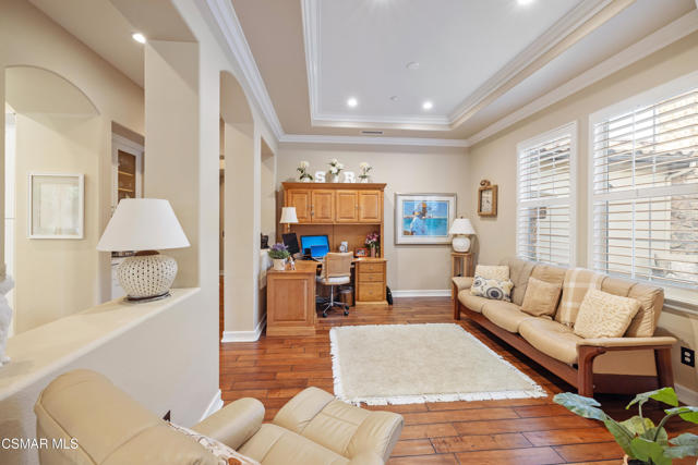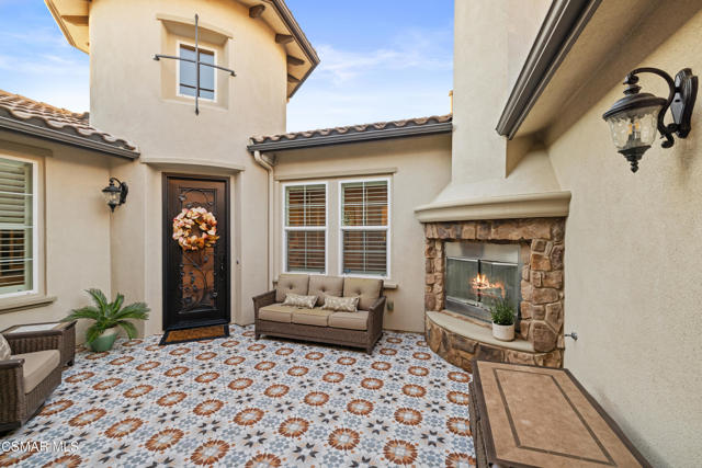 Stunning Single-Story Home in the Prestigious Gated Community of Meridian Hills - Moorpark. Welcome home to this beautifully upgraded corner-lot single-story residence located in the highly desirable gated community of Meridian Hills in Moorpark. Enter through an elegant wrought-iron door into a private custom-tiled courtyard featuring a cozy fireplace, perfect for relaxing or entertaining guests. Inside, you'll find gorgeous wood flooring throughout and a bright open-concept floor plan. The spacious great room seamlessly combines the formal dining area and living room, highlighted by a striking stacked-stone accent wall. The gourmet kitchen is a chef's dream, offering abundant storage and counter space, a large center island with range and seating, quartz countertops, Bosch stainless steel appliances, a Sub-Zero refrigerator, stainless steel sink, and stylish stacked-stone backsplash. The home features two secondary bedrooms, each with its own en-suite bathroom complete with tiled tub/showers and granite counters. A separate office off the dining room provides the perfect workspace and can also be used as a den. The primary suite is a private retreat featuring a tray ceiling and French doors that open to the backyard. The luxurious primary bathroom includes dual sinks, granite countertops, and a beautifully tiled shower with stone accents. The oversized walk-in closet provides extensive shelving and hanging space. Enjoy professionally landscaped grounds, with premium turf in the front yard and a private backyard featuring a concrete patio and decorative rock wall. Additional highlights include: Plantation shutters, Recessed lighting, Dual-pane windows, Crown molding & baseboards, Surround sound system, Custom paint, Professional-grade safe, 2-car garage with additional storage room. Residents enjoy HOA amenities including greenbelt areas, BBQ facilities, basketball court, tennis courts, and pool/spa. Conveniently located near top schools, parks, and shopping. Don't miss the opportunity to see this exceptional home!