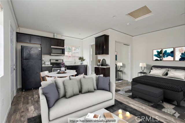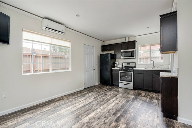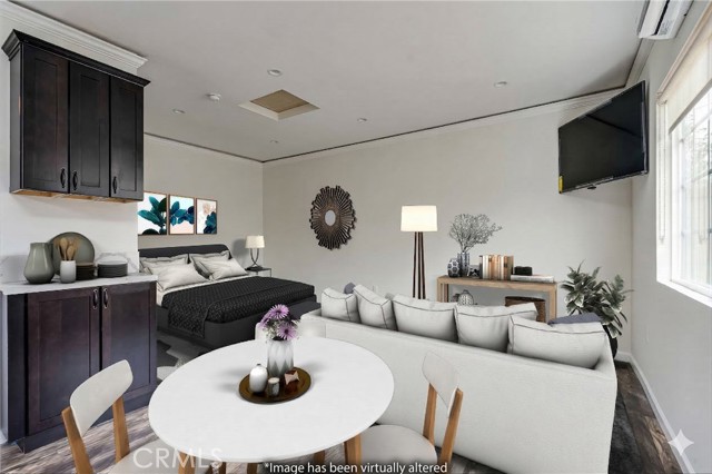 Welcome to this detached studio guest house (ADU) with private entrance and quaint entertaining space. Upon entering, you'll notice the dual paned windows that allow for ample light to flow through this studio space making it light and bright. An open concept kitchen featuring a quartz countertop that has ample storage. Put your own spin on it and define the layout for an eating area, bedroom, and family room; which is perfect for your guests or just lounging around. While there's no access to the main house and yard, there is a private patio where you can make it come alive with potted plants, table and chairs and a bbq or consider outdoor furniture for a resort feel if that's more your style. Virtually staged, it gives you an idea of how to organize this modest space.