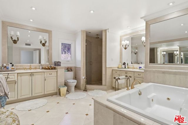 Perched in the prestigious Trousdale Estates, this elegant 4-bedroom, 5-bathroom residence offers approximately 4,200 square feet of refined living space. This stunning home provides a rare blend of privacy, sophistication, and comfort, highlighted by breathtaking panoramic city and ocean views of the Los Angeles skyline.Thoughtfully designed throughout, the home features beautiful marble flooring, expansive open-concept living areas, and walls of glass that seamlessly connect indoor living with the surrounding outdoor scenery. The luxurious primary suite captures incredible views and includes a spa-inspired en suite bathroom along with generous closet space. Each additional bedroom is spacious and well-appointed, offering en suite access and tasteful designer finishes.At the center of the home is a chef's kitchen equipped with top-of-the-line Viking appliances, custom cabinetry, and ample counter space, making it ideal for both entertaining and everyday living.The resort-style backyard is an entertainer's dream, featuring a sparkling pool with an electric pool cover, multiple lounge areas, and an outdoor kitchen with Viking appliances, all perfectly positioned to enjoy the spectacular views. The grounds also feature mature fruit trees, creating a serene outdoor setting that blends natural beauty with luxury living.A gated driveway accommodates up to five vehicles and includes EV charging, providing both convenience and security.
