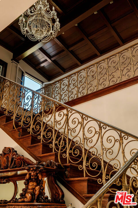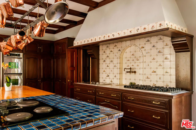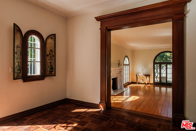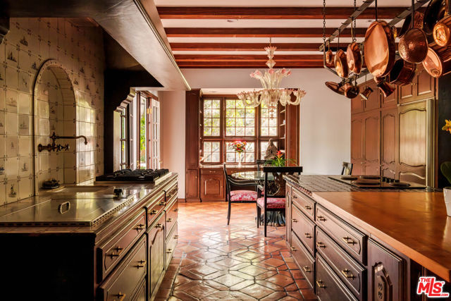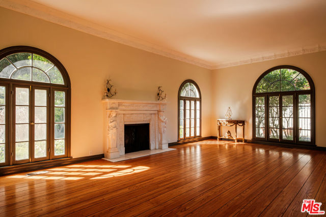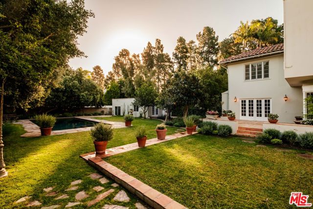Designed by renowned architect Paul Williams, this stately Spanish Colonial Revival residence reflects the timeless elegance of Beverly Hills' golden architectural era. The 4-bedroom, 3.5-bath main home spans approximately 4,171 square feet on a sprawling 19,107-square-foot lot, offering exceptional scale, privacy, and classic character in a prestigious North of Sunset location, moments from the Beverly Hills Hotel. A symmetrical fade, smooth stucco exterior, and clay tile roof introduce interiors defined by grand proportions and beautifully preserved period details. A formal foyer with parquet flooring opens to gracious living and entertaining spaces highlighted by soaring ceilings, crown moldings, arched windows, and French doors that fill the home with natural light. The formal living room features an ornate carved marble decorative fireplace, while a richly paneled library with built-in shelving and French doors offers a refined retreat. Architectural details throughout include rich hardwood floors, elegant millwork, crystal chandeliers, and decorative wall sconces. The kitchen blends warmth and character with wood-beamed ceilings, custom cabinetry, terracotta-style tile flooring, decorative tile-work, and a generous center island. The beautifully updated primary bath features marble finishes, a freestanding soaking tub, and glass-enclosed shower, thoughtfully blending modern comfort with the home's historic character. French doors open to patios, lawn, and lush gardens surrounding a large pool and spa, creating a backyard setting reminiscent of Tuscany. The grounds are enhanced by numerous citrus trees, mature landscaping, and a wonderful sense of privacy. A pool house with 3/4 bath offers added flexibility, while abundant on-site parking provides rare convenience for residents and guests. A distinctive lease opportunity offering architectural pedigree, timeless craftsmanship, and classic Beverly Hills living.