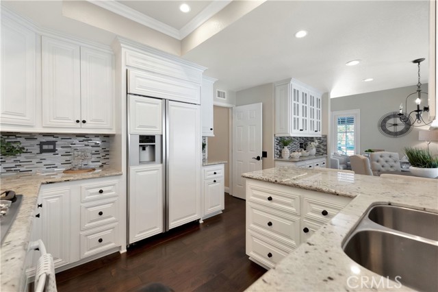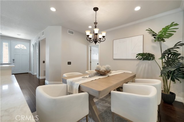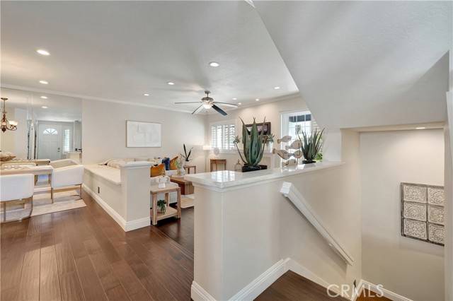 Welcome to this beautifully upgraded end-unit townhome in very quiet location within the highly sought-after, guard-gated community of Pacific Ranch, just minutes from the coast. Offering 4 bedrooms (including a large private bedroom on first floor with en-suite bath), 3.5 bathrooms approximately 2,475 square feet of light-filled living space, this home blends comfort, style, and functionality throughout. Step inside to an inviting living room with soaring ceilings, a cozy fireplace, and sliding glass doors that open to a spacious private porch—perfect for relaxing or entertaining. The home features wood flooring, new custom paint, plantation shutters, newer windows, custom light fixtures, recessed lighting, crown moulding, central AC, ceiling fans, and so much more. The kitchen granite countertops, newer custom cabinetry, a breakfast bar, and a functional layout ideal for everyday living. Family room/office adjacent to the kitchen complete with built-in shelves and French doors leading to an additional outdoor space. The spacious primary suite provides a peaceful retreat with a large bathroom featuring dual sinks, a vanity area, and a custom walk-in shower. Two additional bedrooms offer flexibility for guests, a home office, or additional living space. Additional highlights include an interior laundry room and an oversized attached 3-car garage with built-in cabinetry, epoxy flooring and direct access to the home. Ideally located within the community and offers ample guest parking. Pacific Ranch residents enjoy access to multiple community pools and spas, all just minutes from the beach, shopping, dining, entertainment, and award-winning schools.