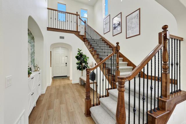 Upgraded Aviara home with coastal breezes and over 2,000 sq ft that’s truly move-in ready in such an ideal location. Built in 2012 and meticulously maintained, this home offers a functional, open layout with seamless flow between the kitchen and family room, while oversized windows fill the space with beautiful natural light. The updated kitchen features Thermador appliances, new countertops, backsplash, and modern lighting, and fresh interior paint throughout gives it that clean, modern feel. You’ll find so much character with upgraded flooring, abundant cabinetry, custom lighting, wood beam accents, a wrought iron staircase, and a cozy fireplace with mantle. All three bedrooms are upstairs, including a spacious primary suite designed for comfort and privacy, plus the convenience of upstairs laundry and great storage. The home is also equipped with A/C, a tankless water heater, and owned solar for energy efficiency. The private backyard is perfect for easy indoor-outdoor living with pavers, a covered patio, and low-maintenance landscaping, and the elevated lot brings in those amazing coastal breezes. There’s also an attached two-car garage with direct access to the kitchen, and the location truly can’t be beat—close to top-rated schools, parks, trails, shopping, dining, and Carlsbad beaches, all with a low HOA. Such a rare opportunity to own a detached home in one of North County’s most desirable communities.