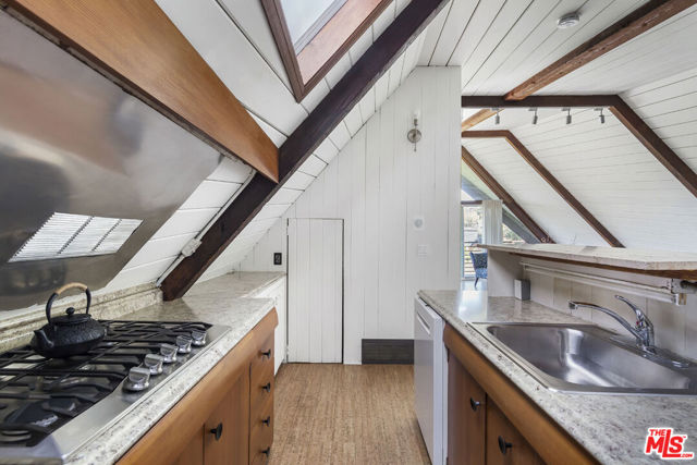 Available for lease, a rare opportunity to live within iconic architecture in the Hollywood Hills. This "Boat House" by architect Harry Gesner was crafted in 1959 by Norwegian shipbuilders, one of eight such residences floating above the treetops in a peaceful canyon setting. Massive windows and sliding doors bring sunshine throughout the day along with a spectacular panorama of verdant hillsides, twinkling lights and the Hollywood Sign. Midcentury architectural details abound including open beams, exposed wood, cork flooring and a unique fireplace. Two bedrooms and an office loft provide everything you need for life-work balance; closet space is ample and the bath has been updated. Enjoy seamless access to the deck where morning coffee and evening cocktails will taste sublime. Amenities include a dishwasher, laundry, central heat+air and covered parking. Sequestered from the city you are just minutes from coffee, dining and hiking trails in Runyon Canyon. Hollywood, Toluca Lake and Studio City are nearby.