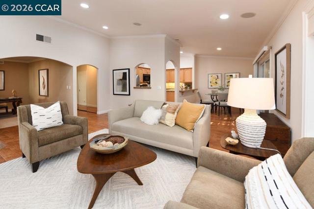 Rarely available Belvedere model. Beautiful 2 BR, PLUS den with effortless level-in access that lives like a single family home, in a great location overlooking a park-like setting of lawn and redwoods. A wall of windows and sliders in the living room and dining area provides a wonderful sense of indoor/outdoor flow. The living room has a fireplace and hardwood floors throughout with built-in lighted cabinetry. Kitchen and bathroom skylights bring in natural light. Kitchen opens to the dining area plus a private patio, perfect for entertaining. The Primary bedroom also has a slider out to its own private patio. New washer/dryer included.