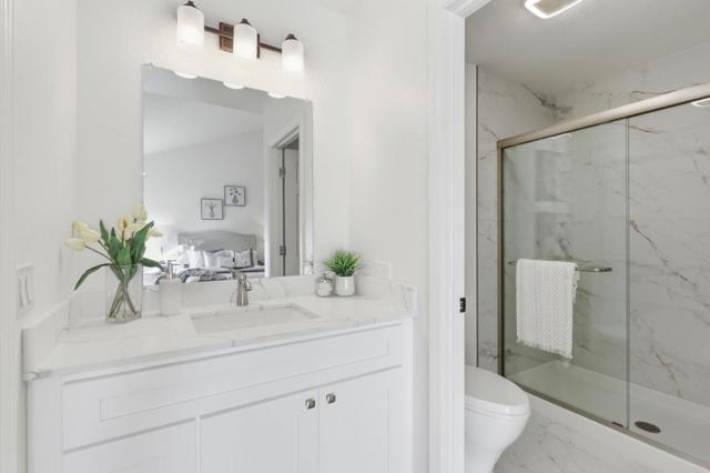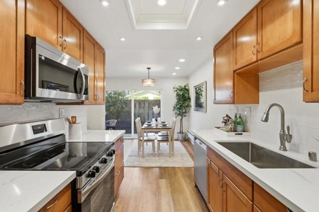 Fabulously updated 2beds,2.5bath townhome with Great Schools! Open floor plan living room enjoys fireplace, LVP flooring throughout the house and access to the private backyard. Gourmet kitchen boasts of Quartz counters with full backsplash, SS appliances, and separate dining area. Both bedrooms are en-suite for ultimate privacy & convenience. One features soaring vaulted ceilings which opens to a large balcony, ideal for morning coffee & enjoying the Bay Area's beautiful year-round weather. The inviting living room, where recessed lighting & frame a cozy fireplace - is perfect for relaxing or entertaining. Outdoors, enjoy a charming backyard with a mature Meyer lemon tree known to produce hundreds of fruits each season & thoughtfully designed patio area perfect for outdoor dining or lounging. Nestled within a well-maintained complex, this home has dedicated in-unit laundry room & 2 private garages(one attached and the other detached). Â Commute from a prime Bay Area location with easy access to HWYs 85/280, minutes from Apple, Google, Microsoft. Live in the great Homestead High/Cherry Chase Elementary area and a block-away Challenger school. Low $390 HOA fee includes hot water and garbage. Don't miss the opportunity to call this house your home.