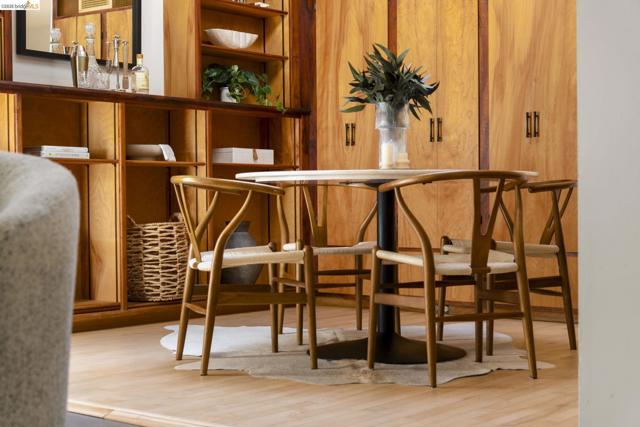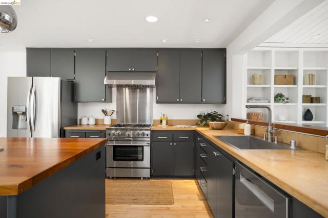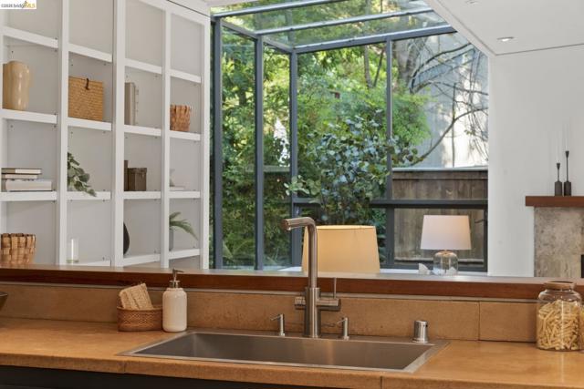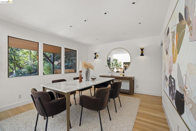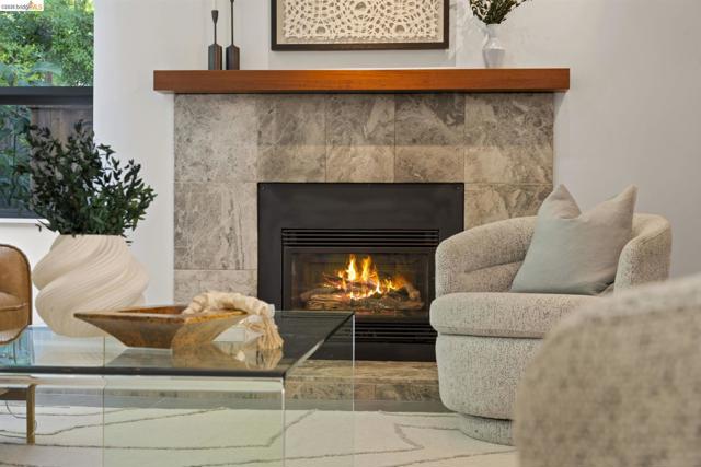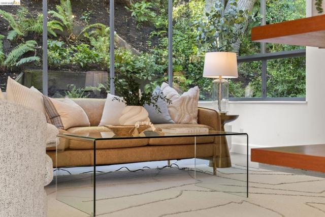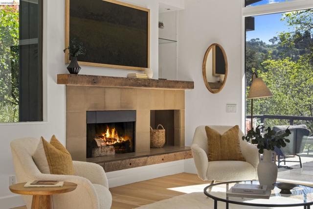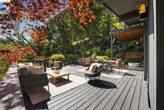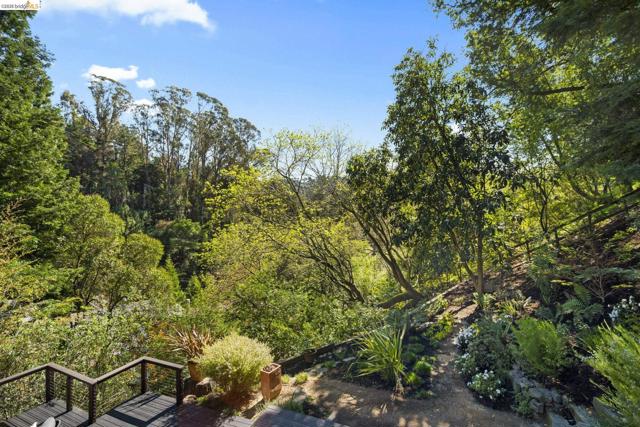 Wooded Montclair Hills Retreat on Private Road. Set on over 1/3 acre along a private road, this distinctive Oakland Hills residence offers exceptional privacy w/flowering trees, lush native plantings, mature wooded grounds & a relaxed Big Sur atmosphere rarely found this close to the city. The main level is anchored by a den w/dramatic corner wall of glass offering uninterrupted views into the surrounding tree canopy. The adjacent chef's kitchen features maple floors, a large center island w/custom hardwood top, stone countertops, stainless steel appliances & pendant lighting, w/a natural flow toward the den ideal for entertaining. A dining room connects to a sunken living room w/its own fireplace & slider doors opening onto rear gardens & spacious decks w/a Japanese-style wood hot tub & elevated forested views. Upstairs, the primary suite includes a refreshed bath & private deck, w/two additional bedrooms w/forested outlooks & a refreshed hall bath completing the upper level. A pergola-beamed two-car garage w/direct interior access & a classic Airstream ideal as a home office complete the grounds. Backup generator & EV charger included. Minutes from Montclair Village shops & restaurants & nearby railroad trail, access & Highway 13. Open Saturday & Sunday, come fall in love!