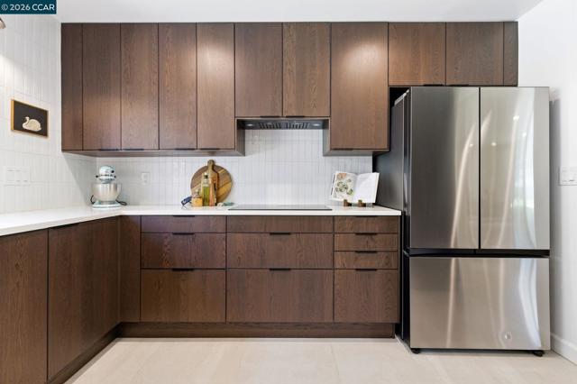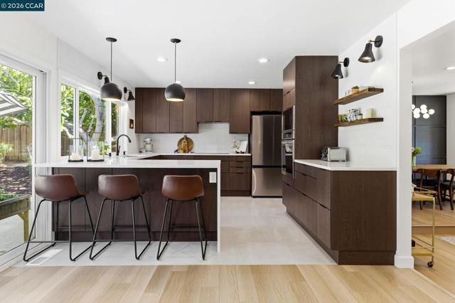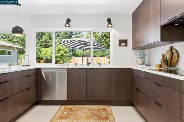 Extensively remodeled single-story home in Dana Farms with an updated interior, modern finishes & a backyard designed for everyday living. Wide-plank flooring, recessed lighting & large windows create bright, open living spaces. The kitchen serves as the centerpiece with flat-panel wood cabinetry, quartz countertops with waterfall edge, induction cooktop, stainless steel appliances, built-in double ovens, tile backsplash & a large island with bar seating, overlooking the backyard. A custom walk-in pantry adds functionality, while sliding doors extend the living space outdoors for indoor-outdoor living. The primary suite offers direct outdoor access, a walk-in closet with built-in organization & integrated lighting, and a bath with a larger walk-in shower & dual vanity. Three additional bedrooms share an updated hall bath. The indoor laundry room includes added storage & workspace. System improvements include upgraded electrical service, updated plumbing & newer water heater. The finished garage includes built-in storage. The backyard offers patio space for dining, lawn area & mature landscaping for privacy. Dana Farms community offers a neighborhood pool & playground, walkable to elementary & middle schools, and near parks, shopping & commuter routes.