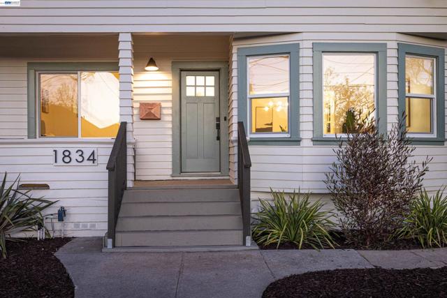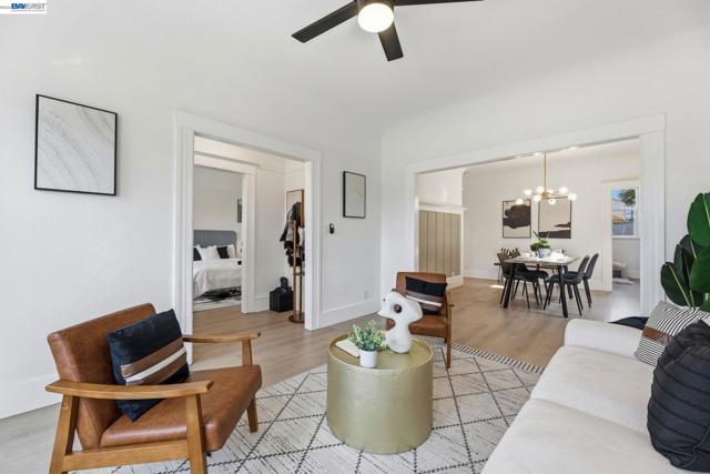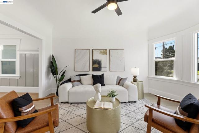Move right in! Recent upgrades include a newer roof, dual-pane windows, HVAC with air conditioning, EV charger, updated flooring, and a fully renovated kitchen and bathrooms. Located in Alameda’s West End, this charming 1905 Craftsman bungalow offers 2 bedrooms, 2 bathrooms, and 979 sq ft of updated living space on a 4,305 sq ft lot. Luxury plank flooring runs throughout. The living room features bay windows and a modern ceiling fan, while the dining room showcases high wainscoting with picture rail and a contemporary brass starburst chandelier. The kitchen showcases white shaker-style upper cabinets, gray lower cabinets, quartz countertops, stainless steel appliances, recessed lighting, and an island with a fluted wood accent panel. The primary bedroom includes an ensuite bath with herringbone tile floors and a tiled stall shower with glass enclosure. The second bathroom features a tiled shower over tub. The landscaped backyard includes a detached structure with French doors and recessed lighting—ideal for an office, studio, or gym. Located near Jean Sweeney Open Space Park, Webster Street shops and dining, and easy Webster/Posey Tube access. Open house Sat 2-4. Sun 3-5